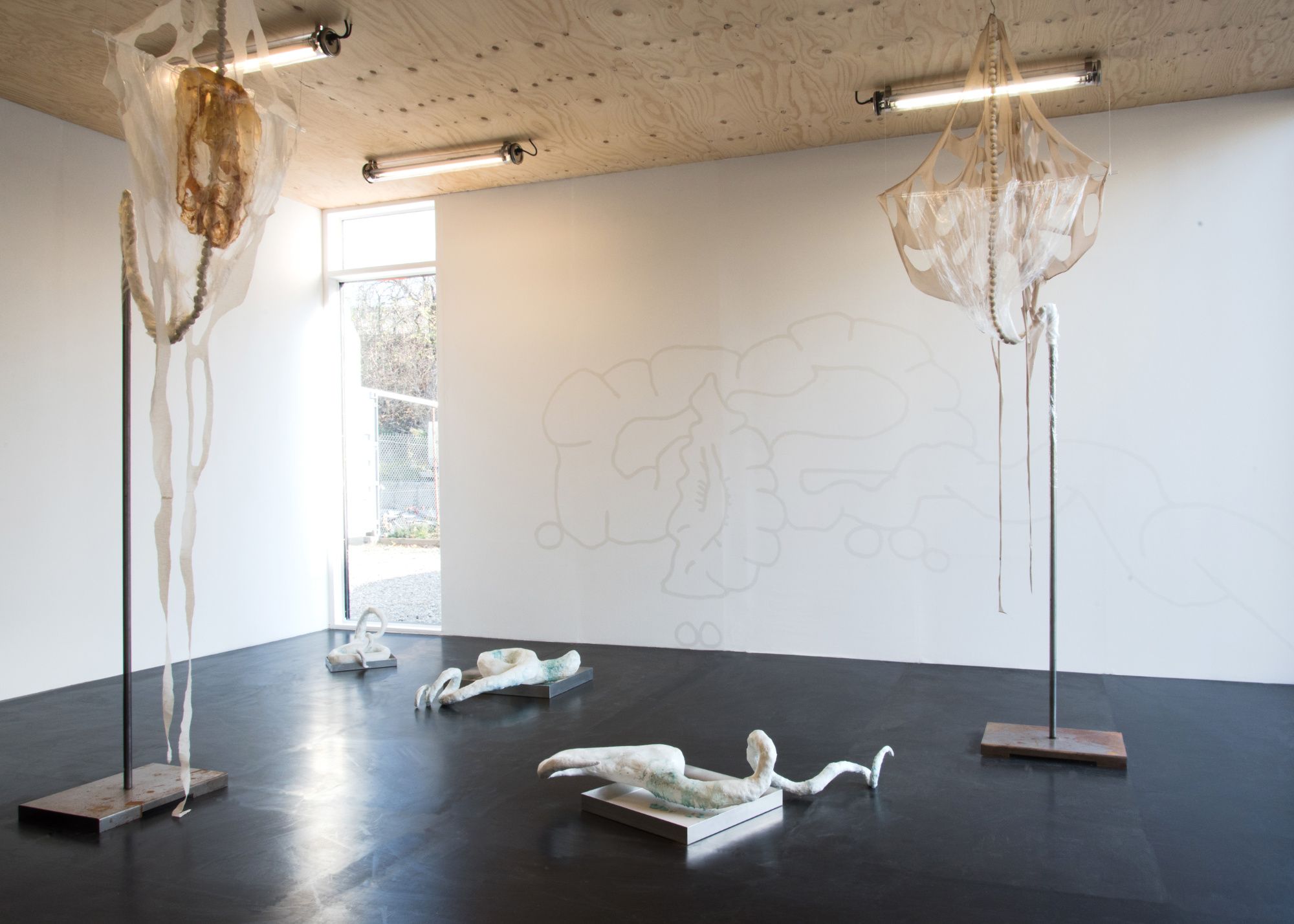 Rising Dissolution consiste en une série de corps hybrides, telles des évocations de l’insondable futur des espèces marines. L'installation s'inspire des conséquences du dérèglement climatique, en particulier de la hausse des températures sur les plages, qui réchauffe les sables où les tortues marines femelles viennent pondre leurs œufs. Ce changement entraîne des mutations et des changements de sexe chez leurs embryons.