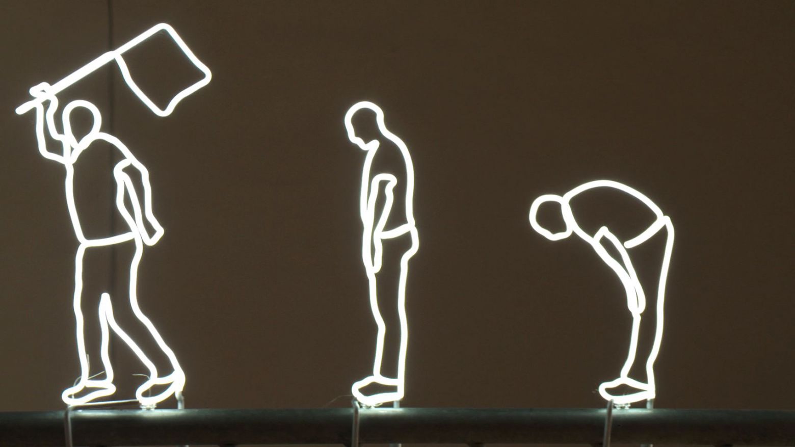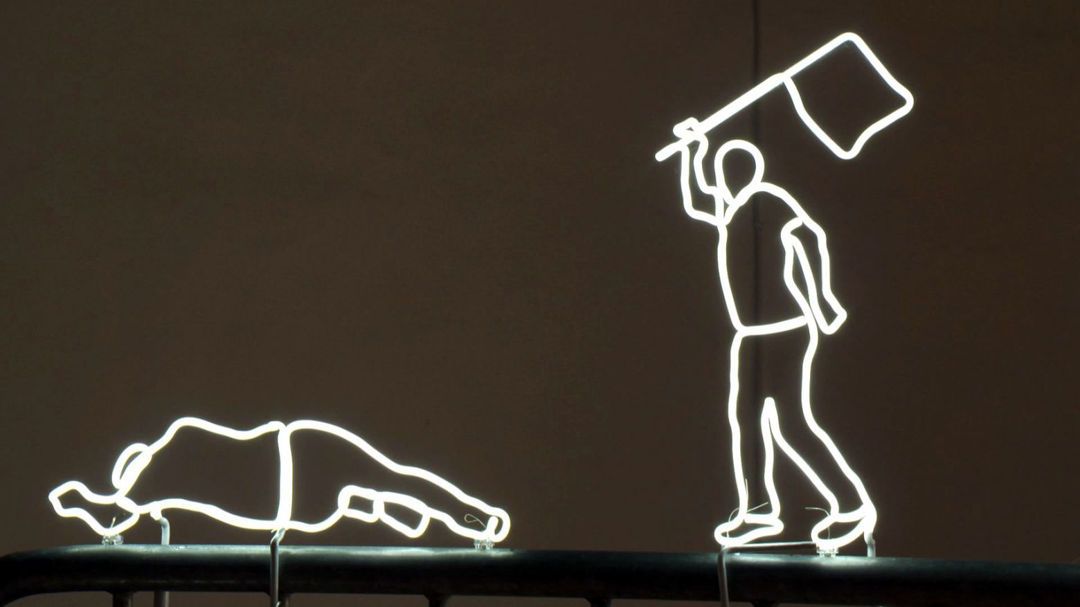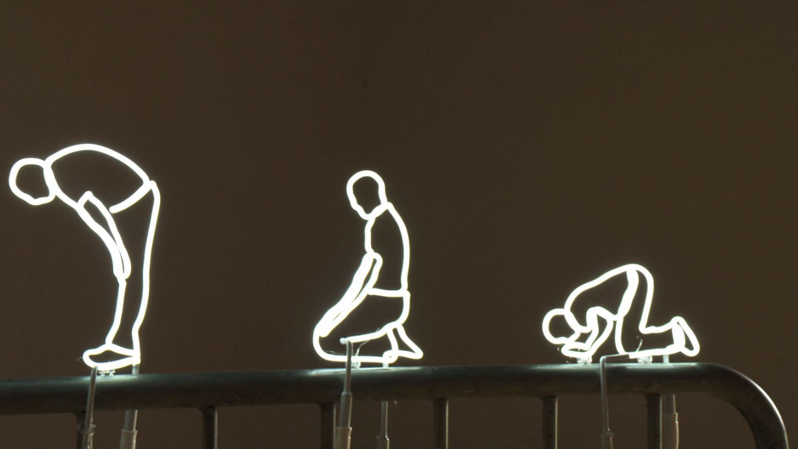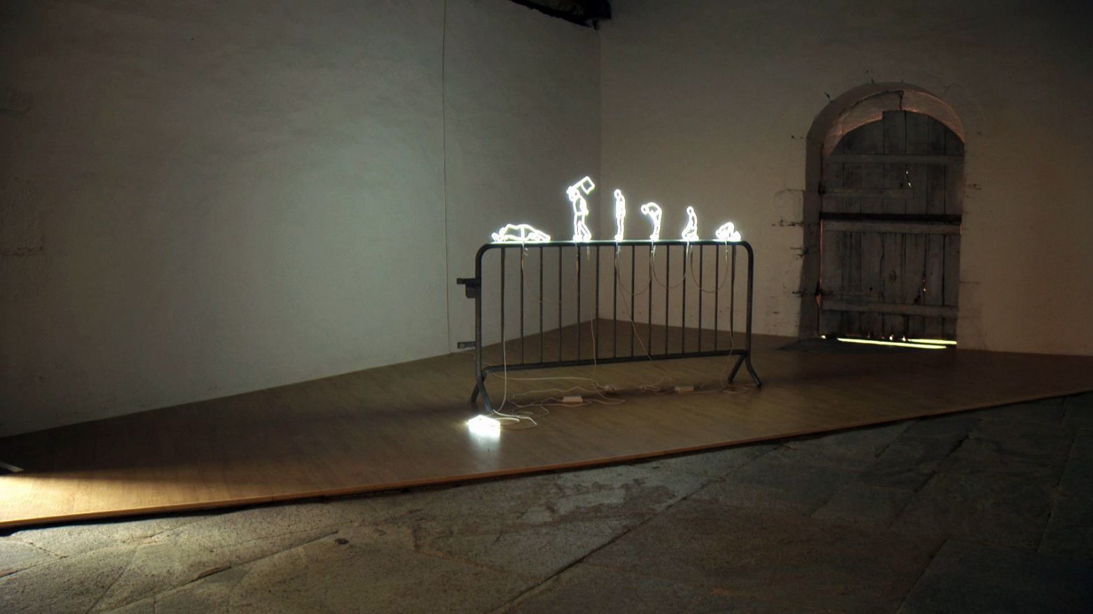 Cette rencontre entre le lieu et la formule produit deux espaces. Un premier, diagonal, à l'intérieur de la chapelle, délimité par un plancher en bois, créant une sorte de scène sur laquelle est posée une œuvre en hommage aux soulèvements arabes. Un second, à l'extérieur, sous forme d'une terrasse composée de dalles de granit blanc, disposées en une calligraphie arabe, où l'on peut lire le mot "Odyssée" - le titre, précisément, de l'œuvre à l'intérieur. Par une sorte de chiasme, l'espace extérieur vient nommer l'espace intérieur qui se réfère à son tour à l'extérieur dans une parfaite symétrie tautologique.