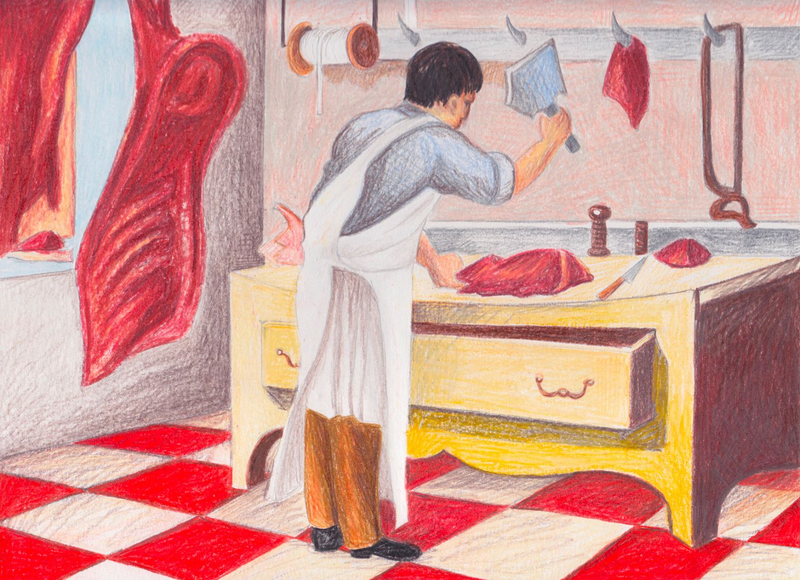 n°5, Le boucher, abrité de son tablier blanc, armé de son couteau tranchant ou du couperet, débite avec dextérité les bêtes dont nous faisons notre nourriture. Sa connaissance des différents morceaux de l'animal est très sûre et nous pouvons lui faire confiance sur ce chapitre, 22 x 30 cm