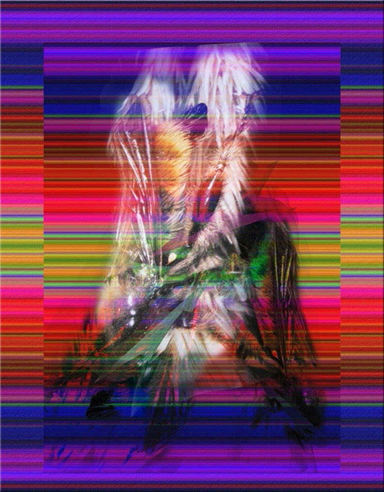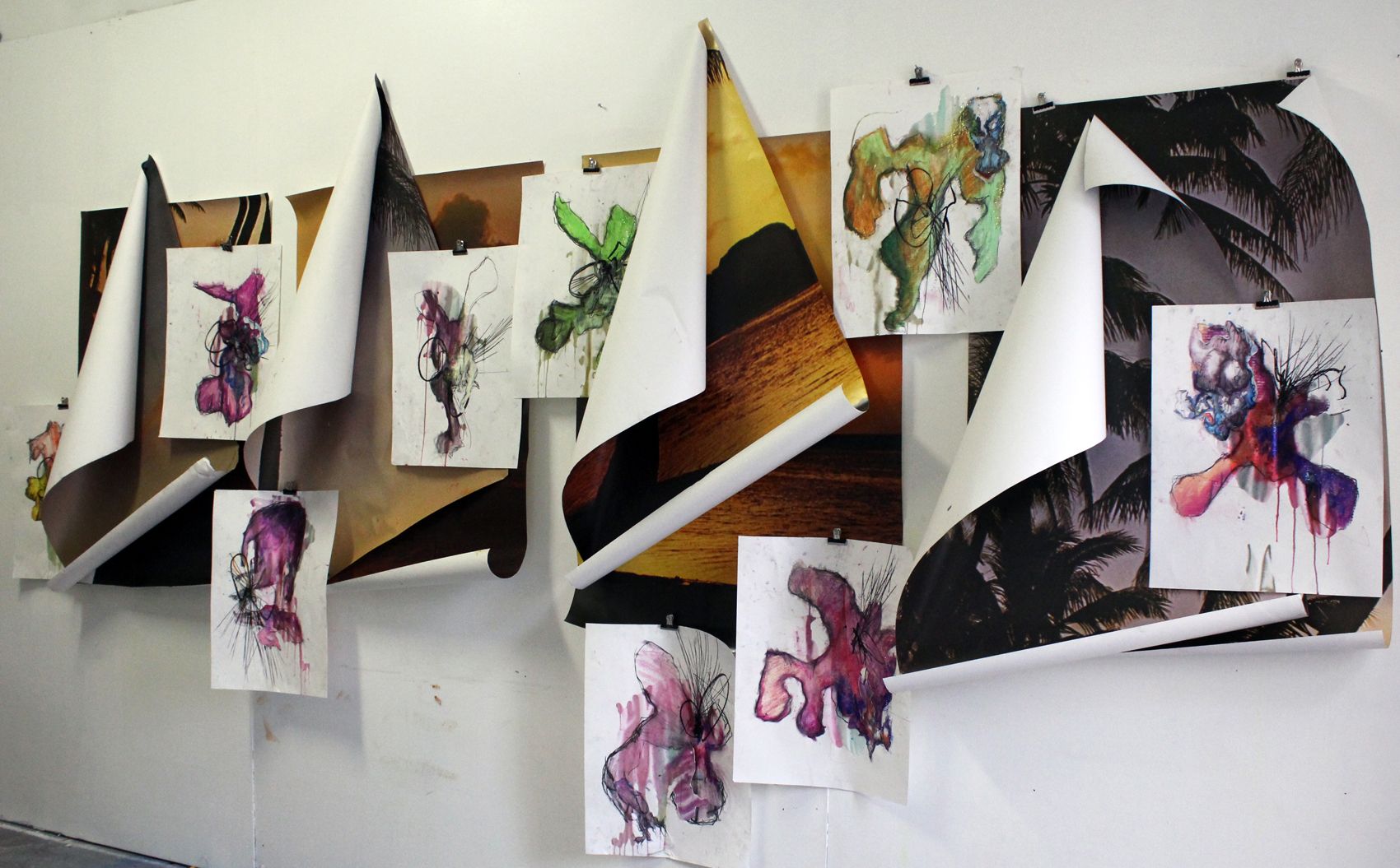 En arrière-plan : une photo de famille qui évoque la relation parfois délicate que peuvent entretenir les poètes avec la normalité d'un foyer de vie... Vision hallucinée des cocotiers, des mers turquoises et du sable fin, son travail articule l'exotisme de salon au registre de la grande surface, remémorant succinctement l'industrie de l'idylle organisée. Comme pour en faire transparaître sciemment la part de citron amer qui en compose les idéaux. "Mordre à son or" se proposant d'être l'acte symptomatique par lequel se développe ce monde presque merveilleux.