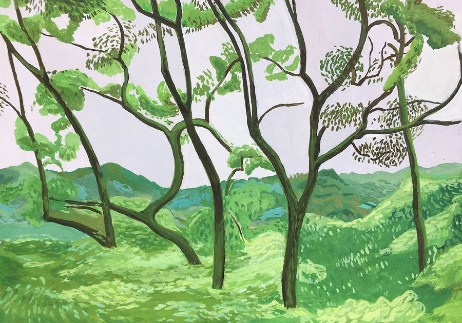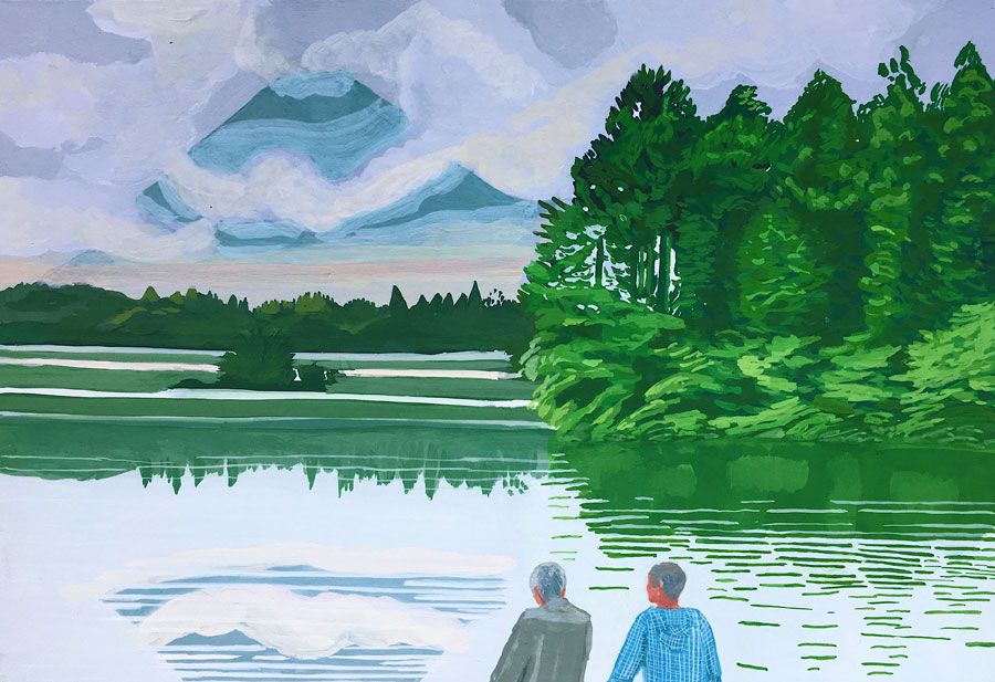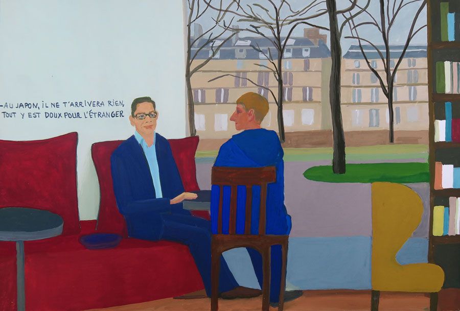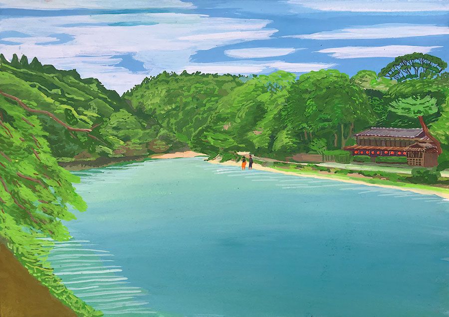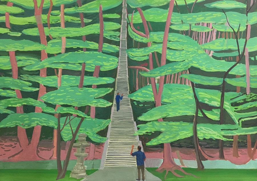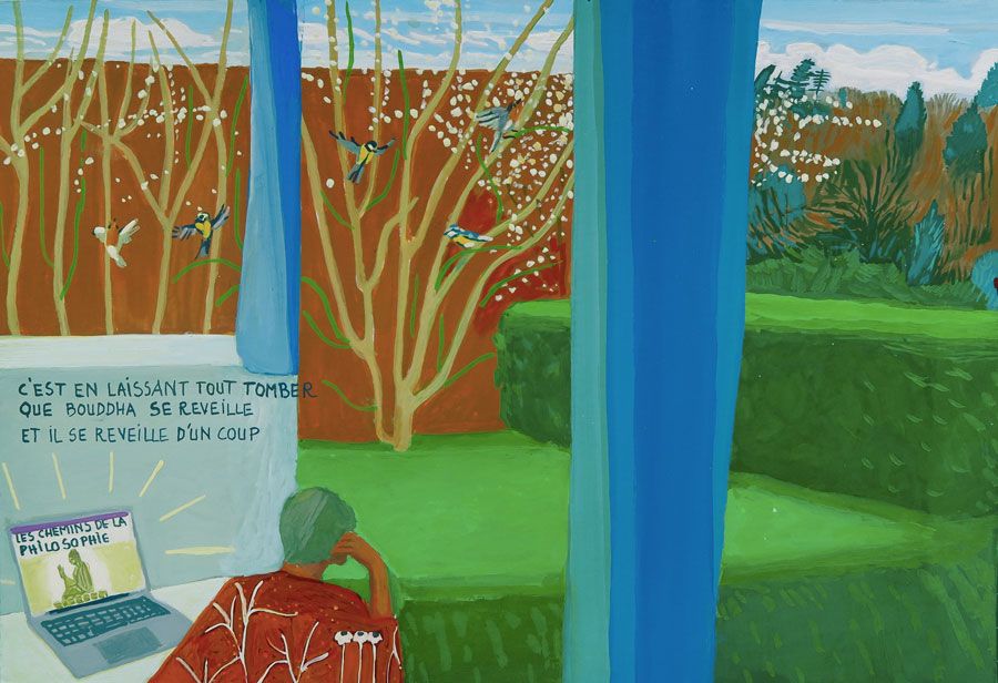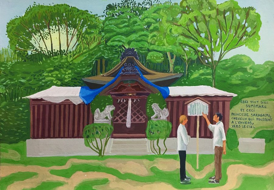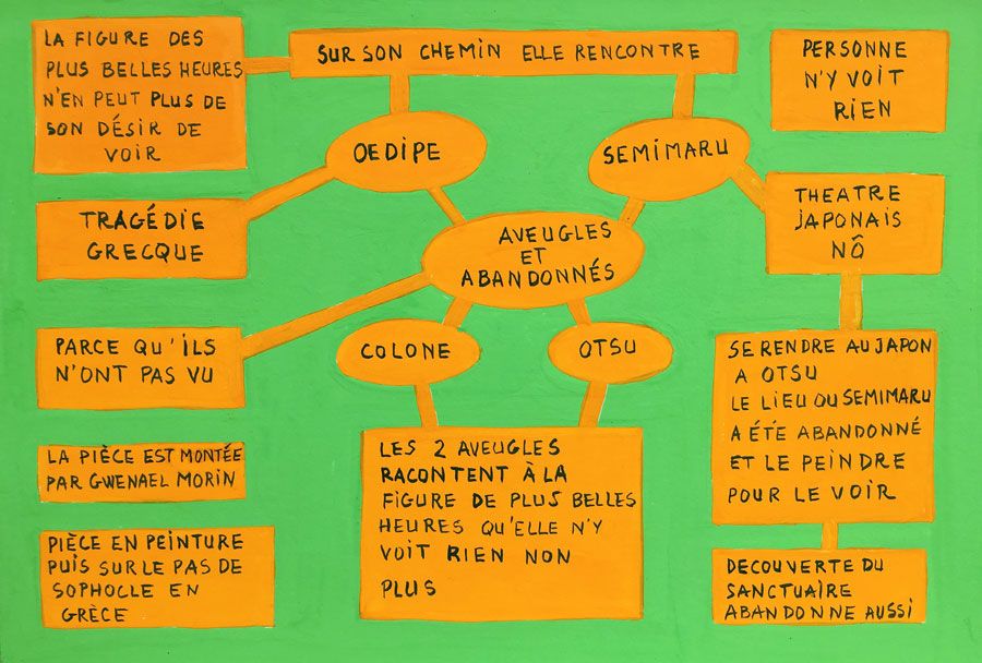 Durant un premier séjour japonais à l'été 2019, fut réalisée une suite de 26 peintures ainsi qu'une prise de notes avec l'intention de revenir pour compléter cette approche et approfondir les correspondances possibles entre deux récits tragiques grecs et japonais et entre les cultures respectives qui les ont vus naître. Au cours de ce voyage a été réalisée une première reconnaissance de lieux : Kyoto, sa forêt, approche du sanctuaire de Semimaru à Otsù, les rives du Biwa à Ômi, scènes et paysages proches du mont Fuji, bords de mer du Pacifique, Tokyo, ville et stations du Tokajaido peintes par U.Hiroshigé (par délicatesse pour la compréhension du monde japonais, les peintures ont principalement eu pour sujet des paysages). Ainsi, vie et peinture s'enchaînent et se rejouent, dans un recommencement qui traduit la joie d'être au monde. [...]