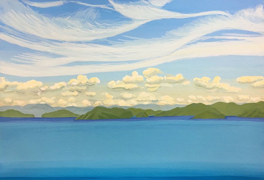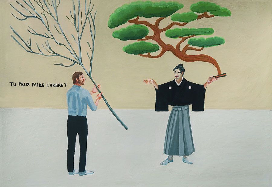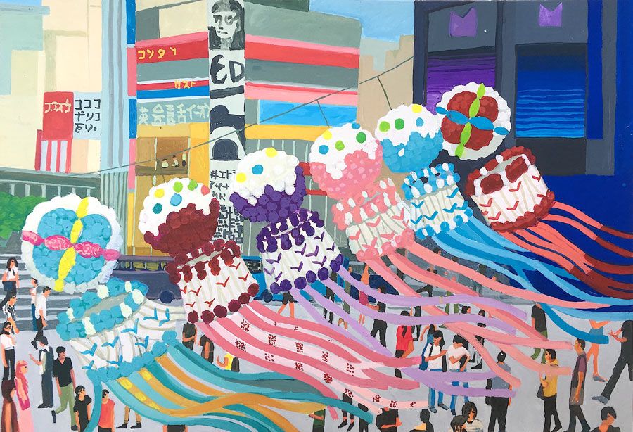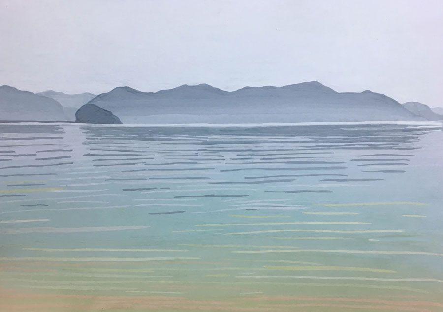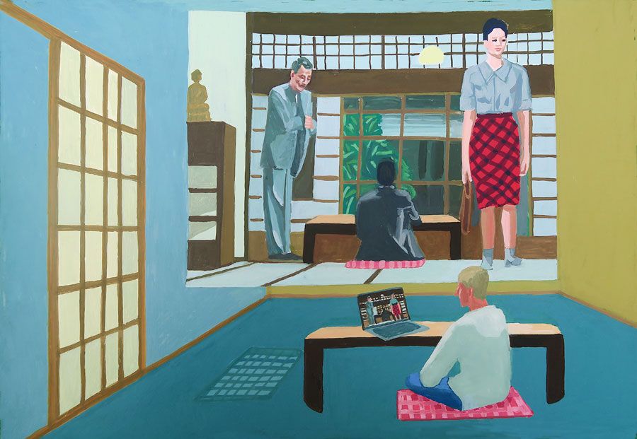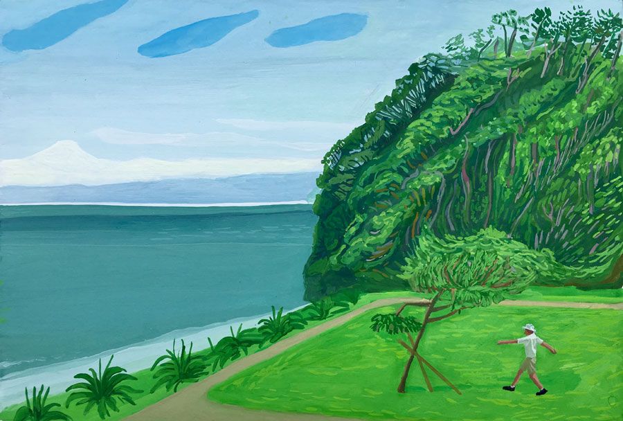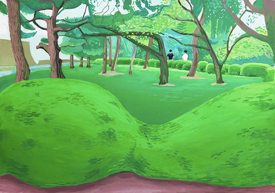 Durant un premier séjour japonais à l'été 2019, fut réalisée une suite de 26 peintures ainsi qu'une prise de notes avec l'intention de revenir pour compléter cette approche et approfondir les correspondances possibles entre deux récits tragiques grecs et japonais et entre les cultures respectives qui les ont vus naître. Au cours de ce voyage a été réalisée une première reconnaissance de lieux : Kyoto, sa forêt, approche du sanctuaire de Semimaru à Otsù, les rives du Biwa à Ômi, scènes et paysages proches du mont Fuji, bords de mer du Pacifique, Tokyo, ville et stations du Tokajaido peintes par U.Hiroshigé (par délicatesse pour la compréhension du monde japonais, les peintures ont principalement eu pour sujet des paysages). Ainsi, vie et peinture s'enchaînent et se rejouent, dans un recommencement qui traduit la joie d'être au monde. [...]