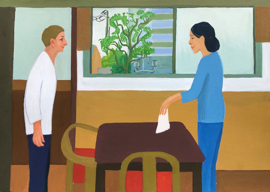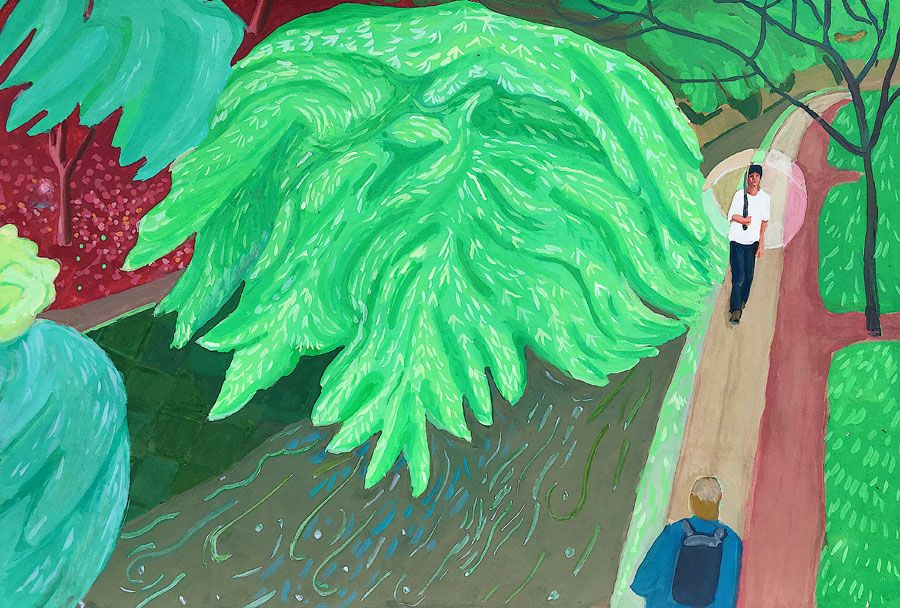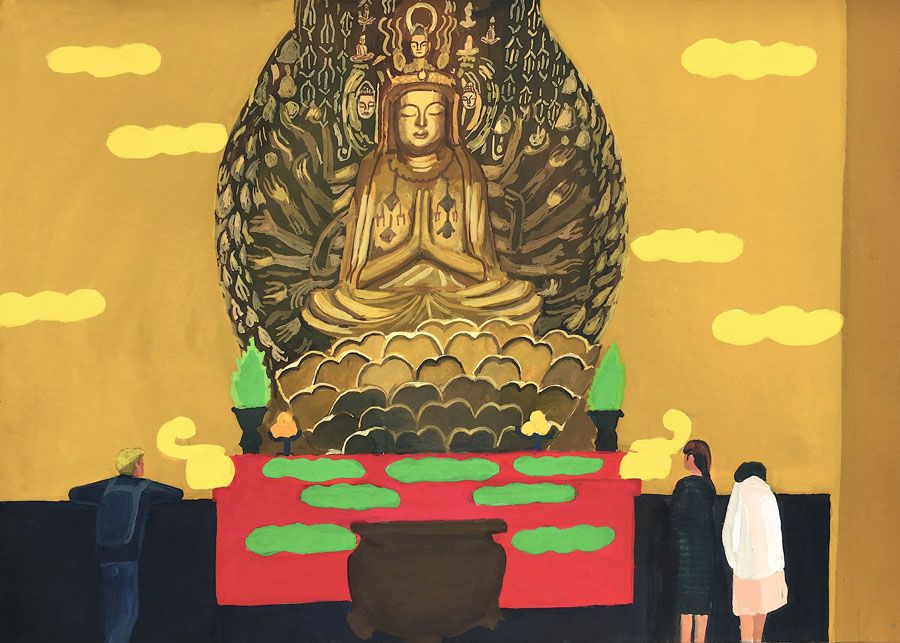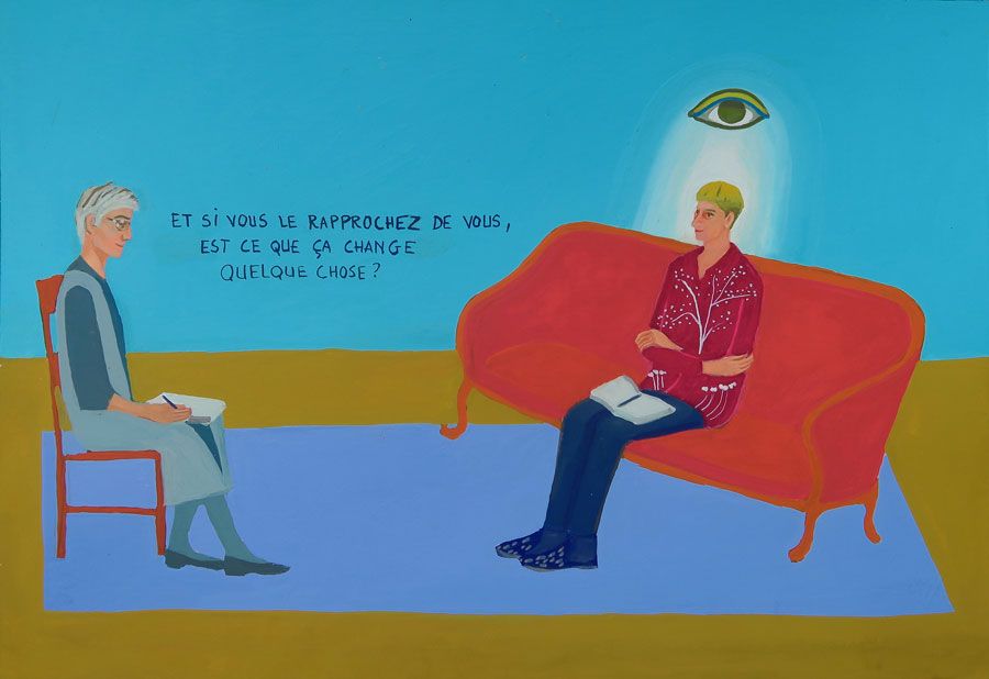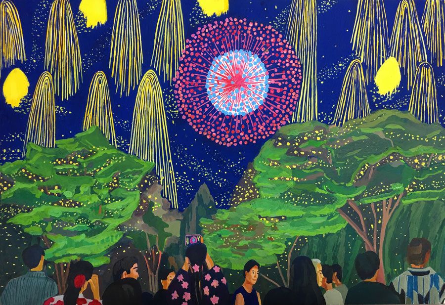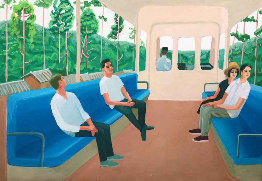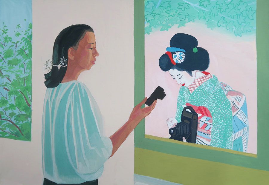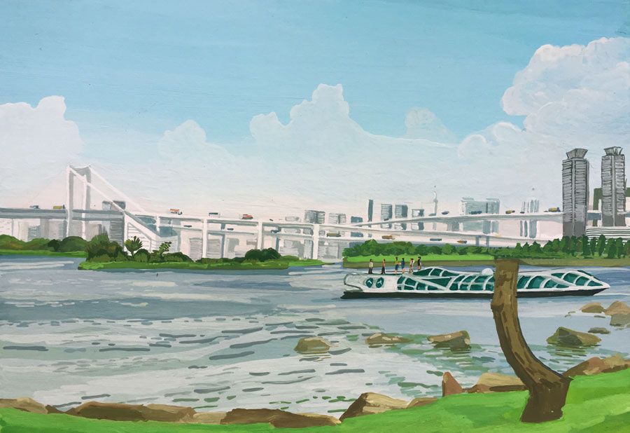 Durant un premier séjour japonais à l'été 2019, fut réalisée une suite de 26 peintures ainsi qu'une prise de notes avec l'intention de revenir pour compléter cette approche et approfondir les correspondances possibles entre deux récits tragiques grecs et japonais et entre les cultures respectives qui les ont vus naître. Au cours de ce voyage a été réalisée une première reconnaissance de lieux : Kyoto, sa forêt, approche du sanctuaire de Semimaru à Otsù, les rives du Biwa à Ômi, scènes et paysages proches du mont Fuji, bords de mer du Pacifique, Tokyo, ville et stations du Tokajaido peintes par U.Hiroshigé (par délicatesse pour la compréhension du monde japonais, les peintures ont principalement eu pour sujet des paysages). Ainsi, vie et peinture s'enchaînent et se rejouent, dans un recommencement qui traduit la joie d'être au monde. [...]