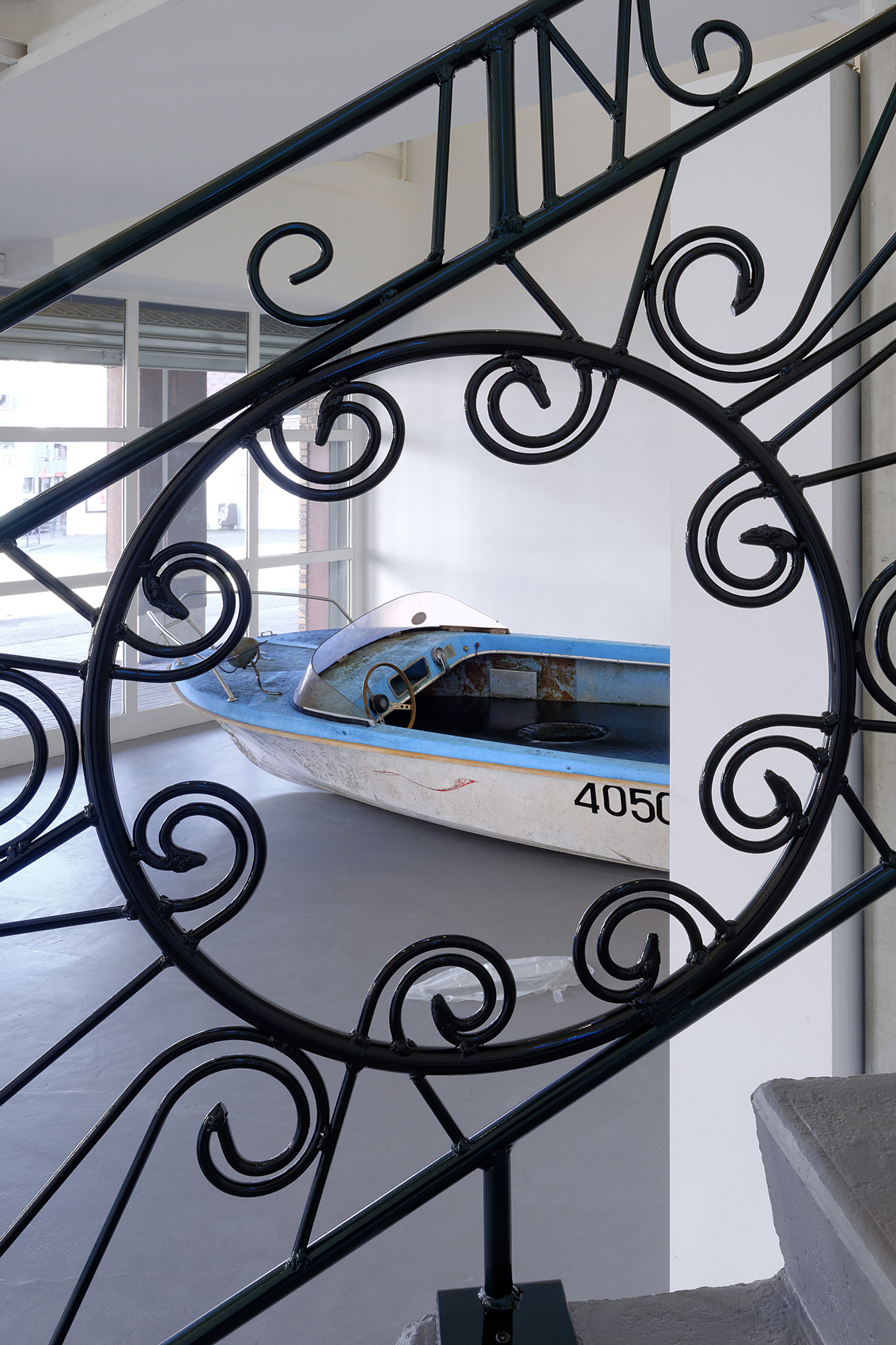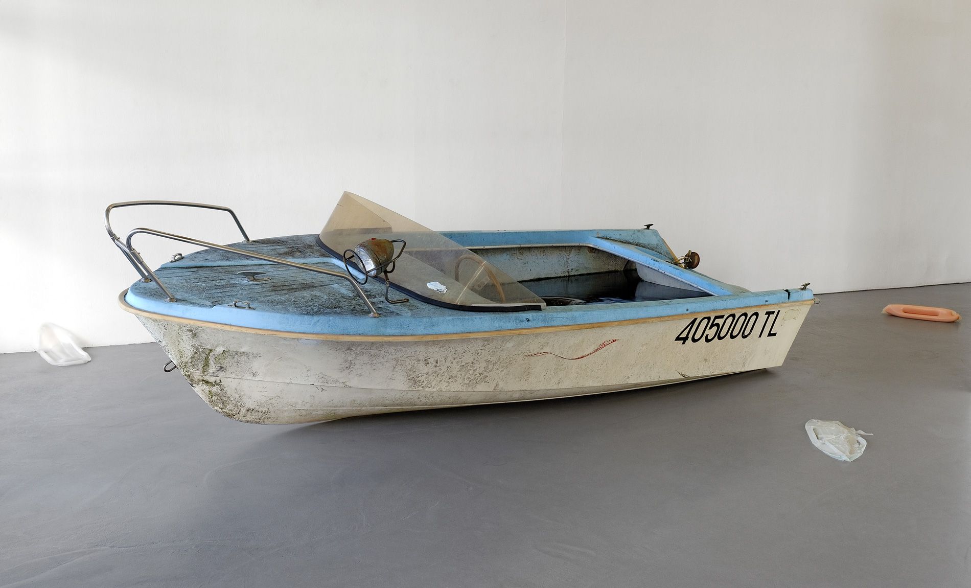 "Le canot a pris l'eau et n'est pas près d'être remis à flot. L'eau qui s'y engouffre ne cesse de le creuser de l'intérieur et le large trou percé dans sa coque semble être un puits sans fond où toutes les mers du monde viennent se jeter, encore et encore. Le naufrage est solitaire. Il s'auto-alimente et s'abreuve toujours à la même eau noirâtre. C'est vrai des individus frappés par le malheur et la dépression. C'est vrai aussi de ce canot que plus rien ne peut sauver. Même si, il faut bien le reconnaître, sa situation ne s'aggrave pas : elle stagne. Ce que met en scène d'ailleurs la position bancale de cette sculpture (Le calme après la tempête) : à demi-renversée sur le flanc, elle n'abdique pas complètement et trouve un point d'équilibre pour redresser une proue fiérote. Pas question de succomber entièrement, mais bien de contrebalancer le désastre par une pointe d'orgueil, ou par une force et des principes physiques, voire mécaniques. [...]"