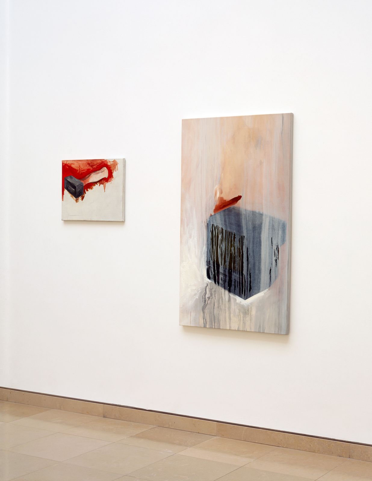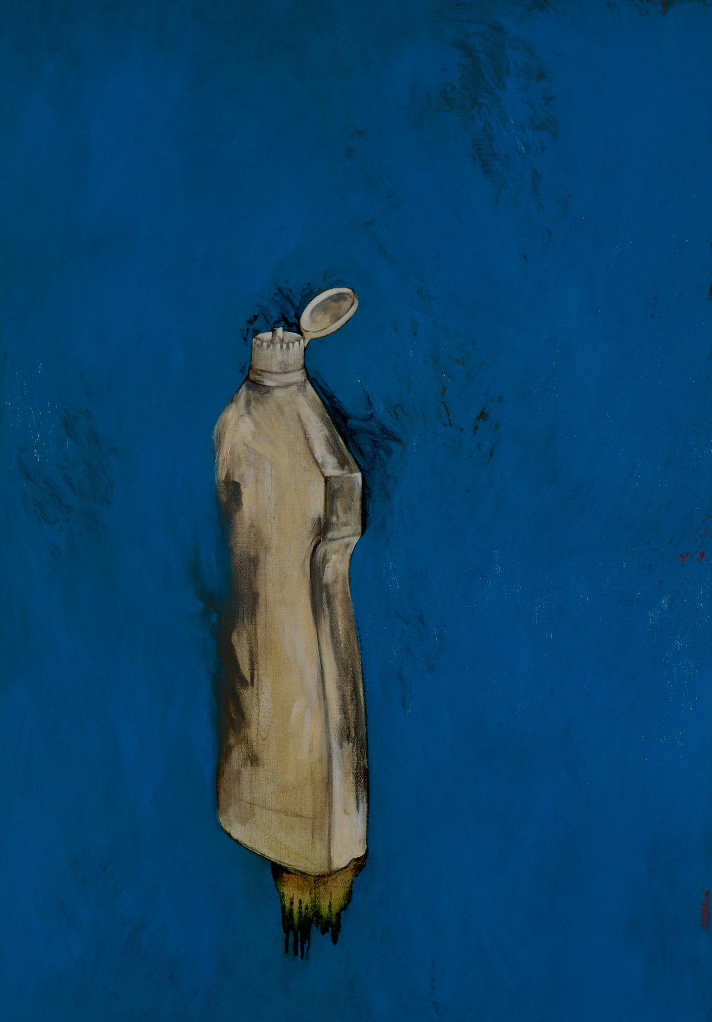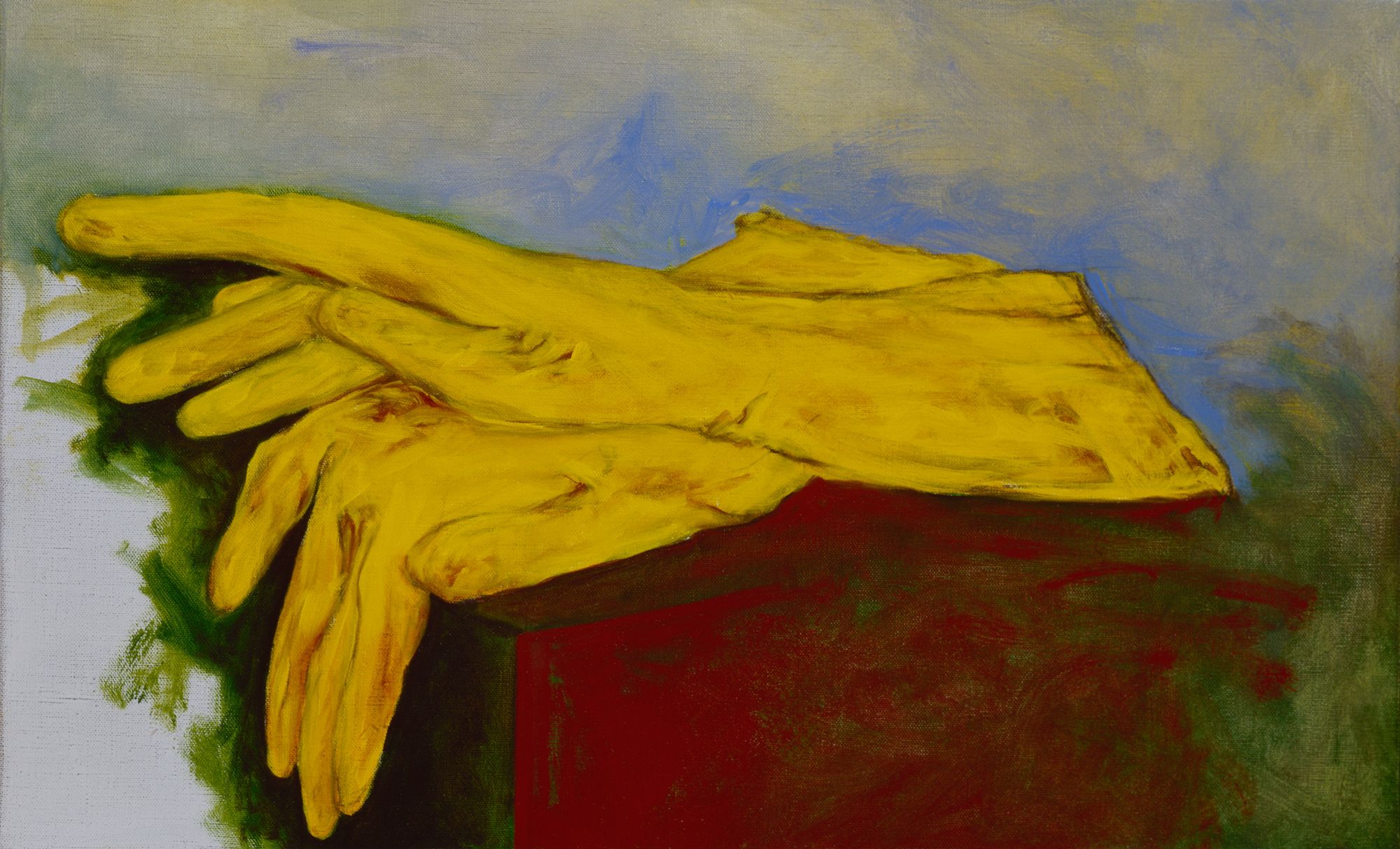 Onguents de peinture. Objets triviaux. Gants pour vaisselle. Masse. Produit à détacher. Un trouble entre ; objet représenté / éclat pictural. Préhension de la main. La couleur prend. Écran noir. Circulations d'énergies. Objets chargés surnagent.