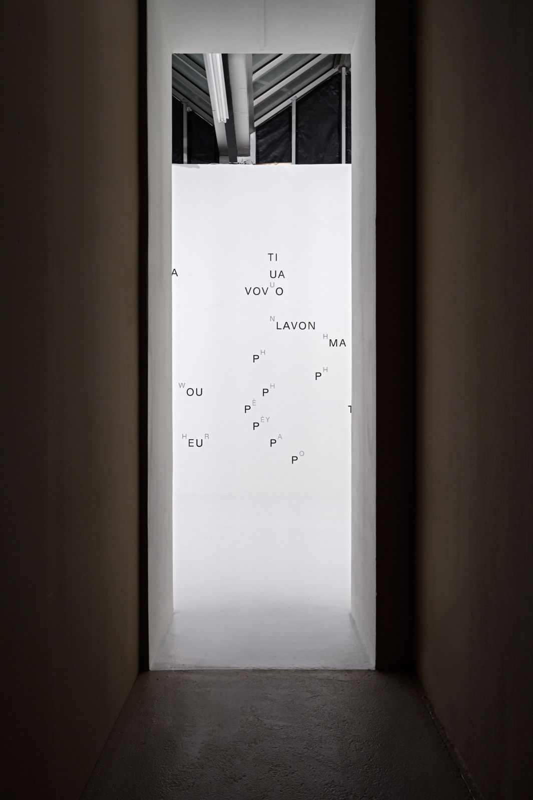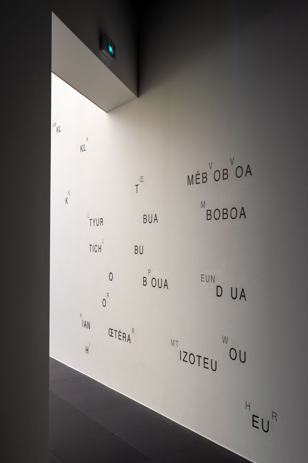 Une première version a donné lieu a un livre d’artiste réalisée en 2020 avec le Centre d’art la Graineterie et édité par Florence Loewy. Une deuxième version, une partition murale de 7 mètre de long a été réalisée pour l’exposition « L’Art d’apprendre. Une école des créateurs » au Centre Pompidou-Metz (2022). Cette partition spatiale invite à une lecture à entrées multiples. Le regard circule entre les différents « ilots syllabiques » et déchiffre les sons des lettres à la manière de l’enfant qui apprend à lire et prononce chaque son de chaque lettre. Sauf qu’ici l’expérience demande un entraînement de double lecture entre les sons principaux et secondaires, rapprochant la langue de l’onomatopée et du bruit