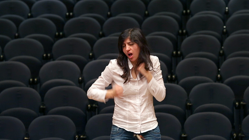 Une première vidéo présente un montage muet mettant en vis-à-vis la gestique « inductive » du chef d'orchestre qui impulse le son, et la gestique « réceptive » de la langue des signes qui décrit l'image de la répétition.