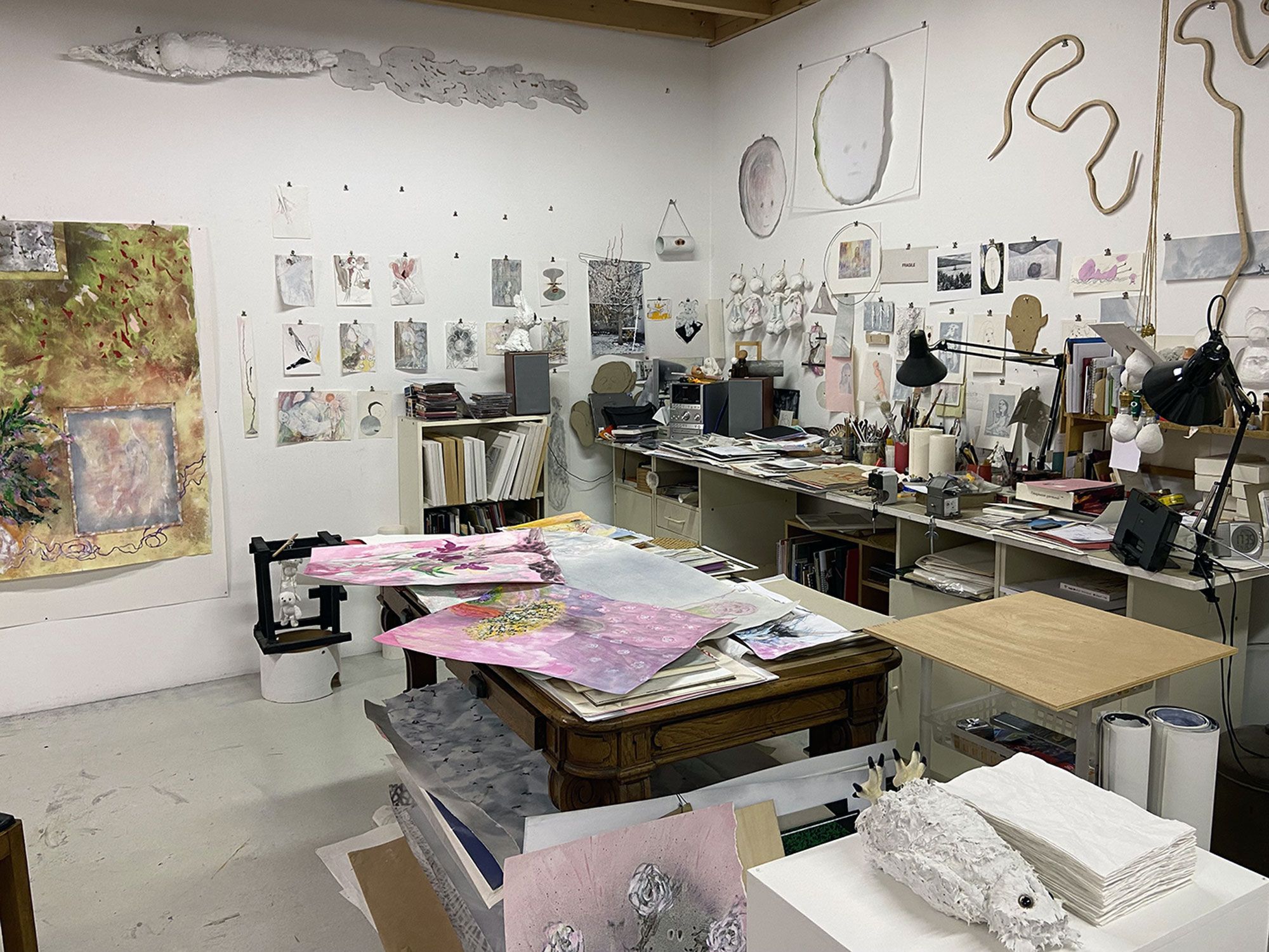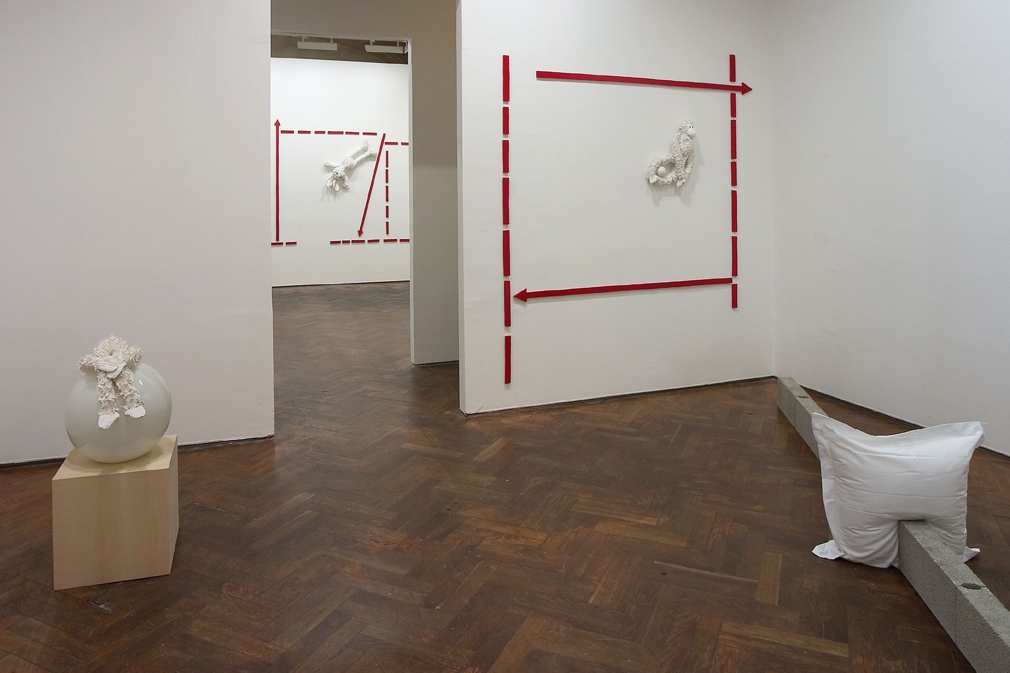 Dessin sur papier à la poudre de graphite, peluche, peinture, oreiller, 45 x 100 x 25 cm