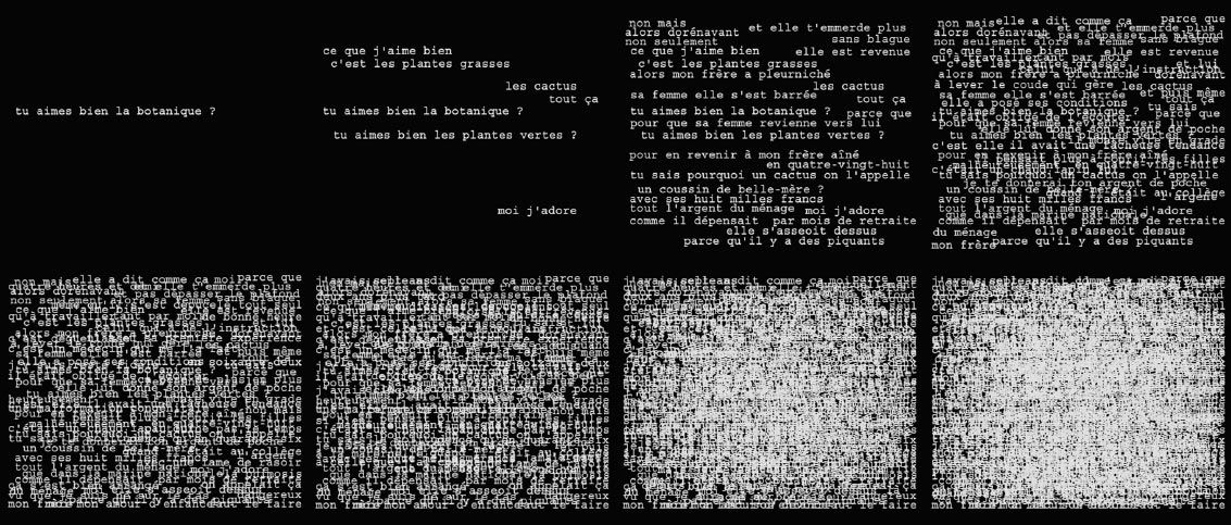 Cette vidéo entreprend la transcription mot à mot d'un monologue de Michel, un personnage d'une soixantaine d'année vivant très pauvrement dans la ville de Rennes. Ce monologue est le fruit d'un long entretien avec lui. Le texte, d'une logique toute particulière, est parfois violent. Michel raconte sa vie à travers une vision du monde à la fois naturaliste et fantasmatique, mysogine et enfantine. Une voix féminine lit ce texte créant chez le spectateur l'incertitude quant à l'identité du narrateur. Le texte s'affiche simultanément à la voix off. Le texte s'accumule jusqu'à devenir totalement illisible.