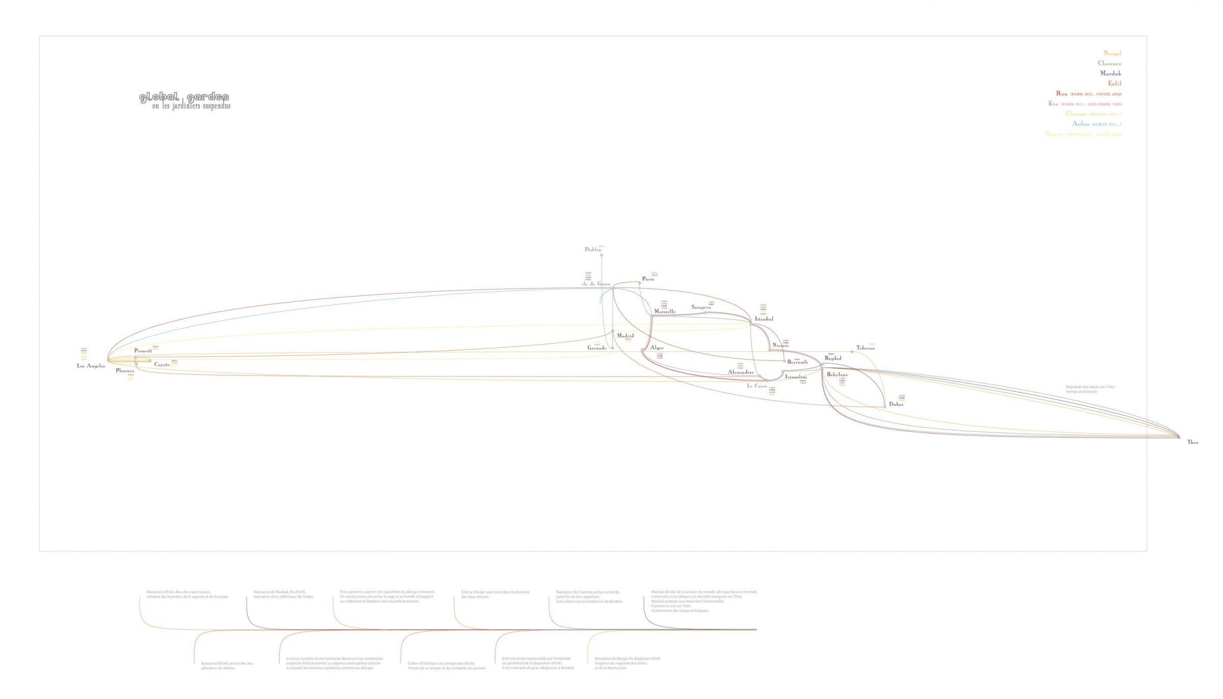 Le script ne détermine pas une voie figée pour les vidéos futures mais indique des sortes de nœuds (dates, lieux, personnages) destinés à produire un texte, des images ou du son. La vocation essentielle de Global garden ou les jardiniers suspendus est d'offrir un cadre et un moteur à la création de vidéos. Un cadre qui se voit, à chaque nouvelle création, enrichi par la rencontre avec un territoire spécifique et restreint (île de Groix, Rueil-Malmaison, St-Jacques de la Lande...).