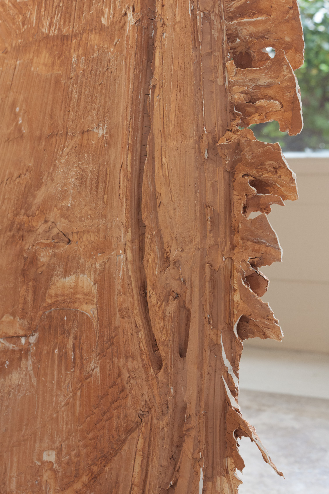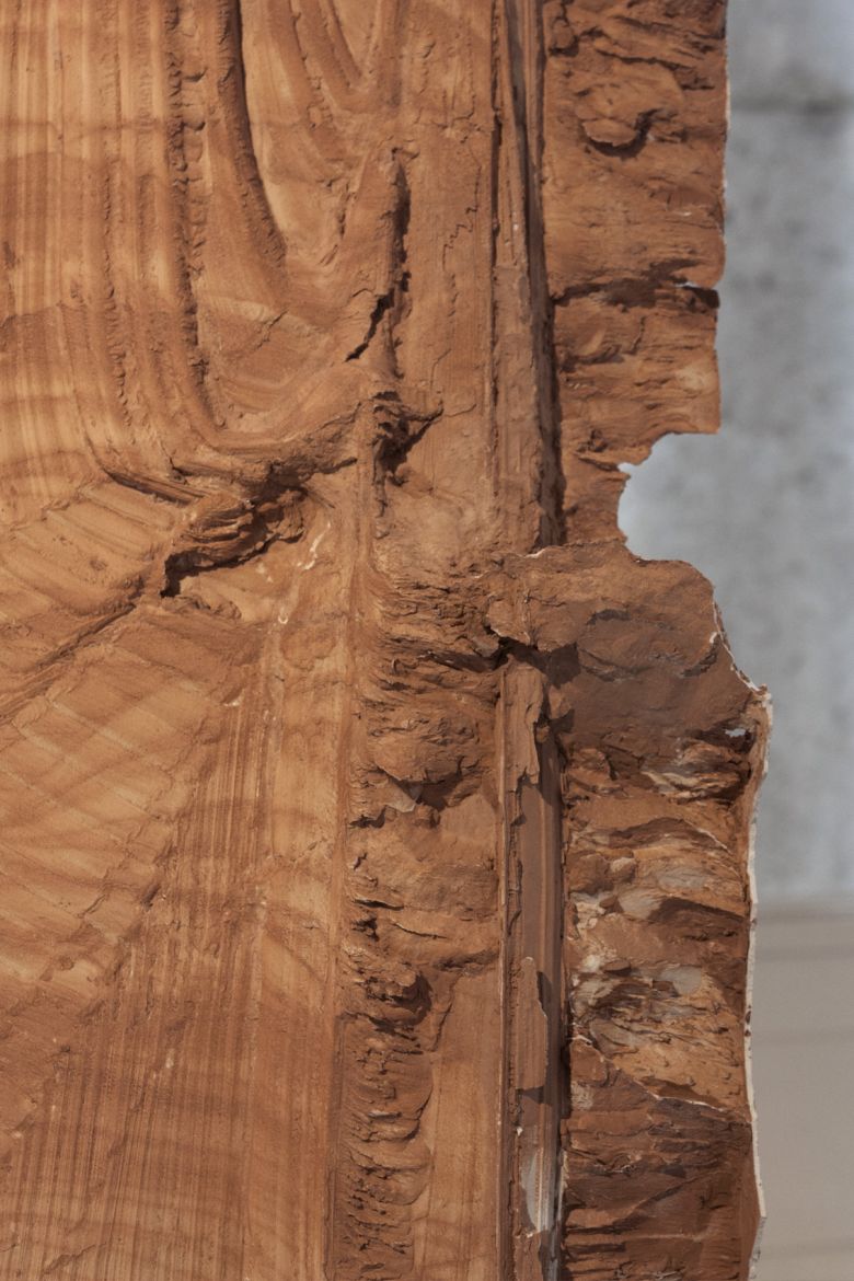 Moulage d'une fente ouverte et tirée à l'aide d'une corde dans un mur d'argile. La forme est retournée et présentée sur la partie la plus large comme base.