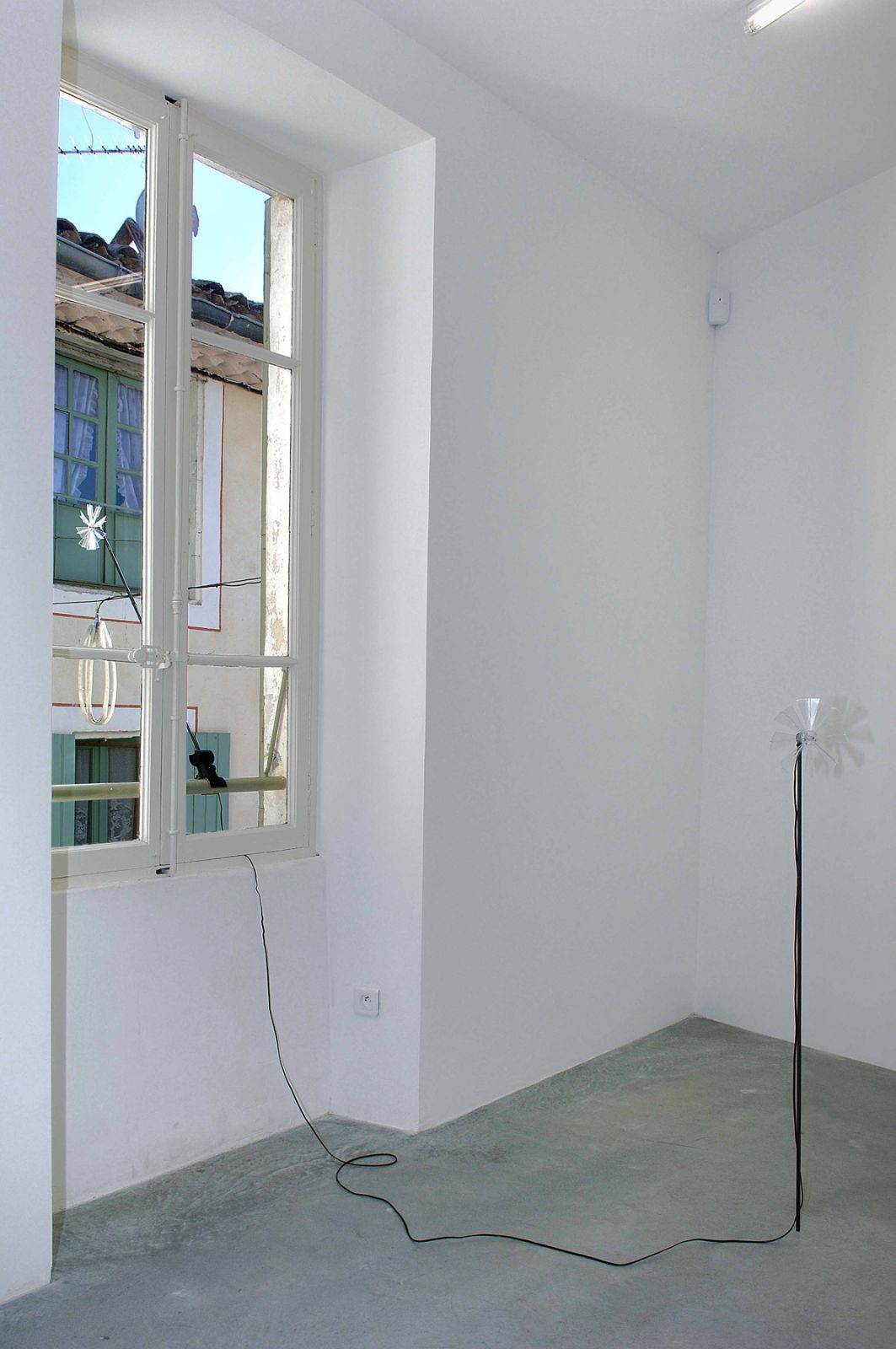 Eolienne à l'extérieur alimentant un ventilateur à l'intérieur.
