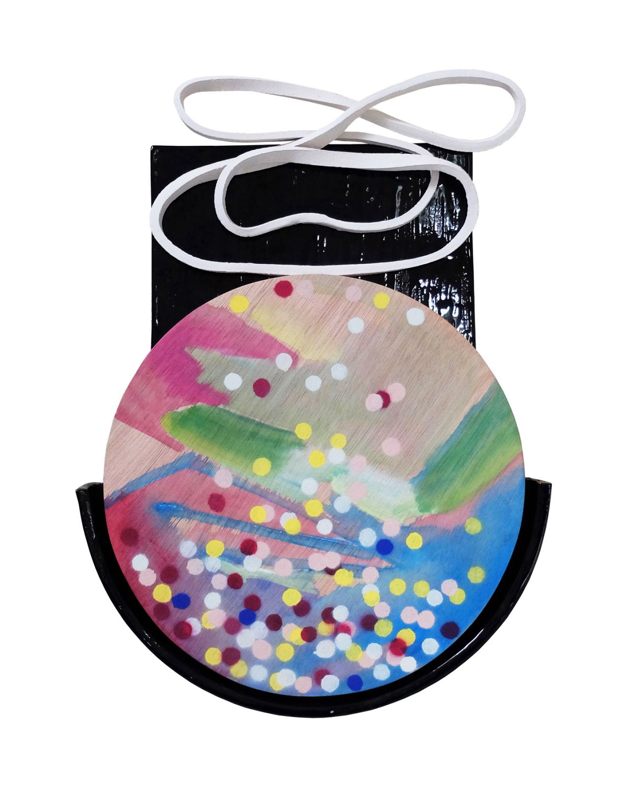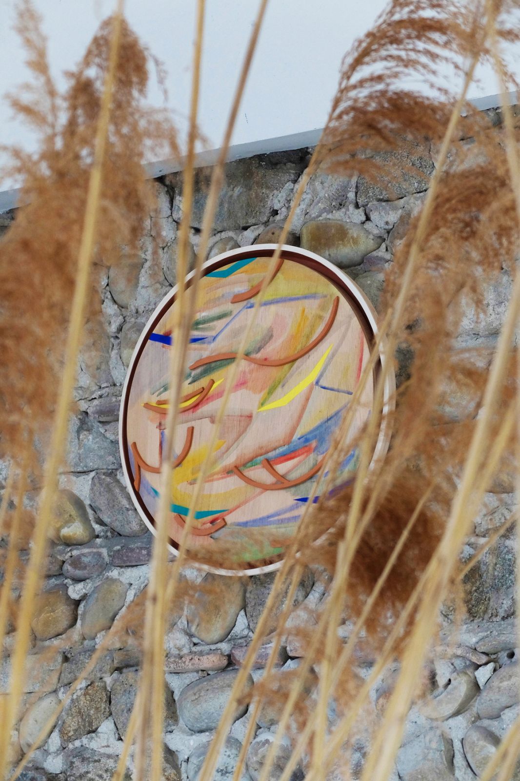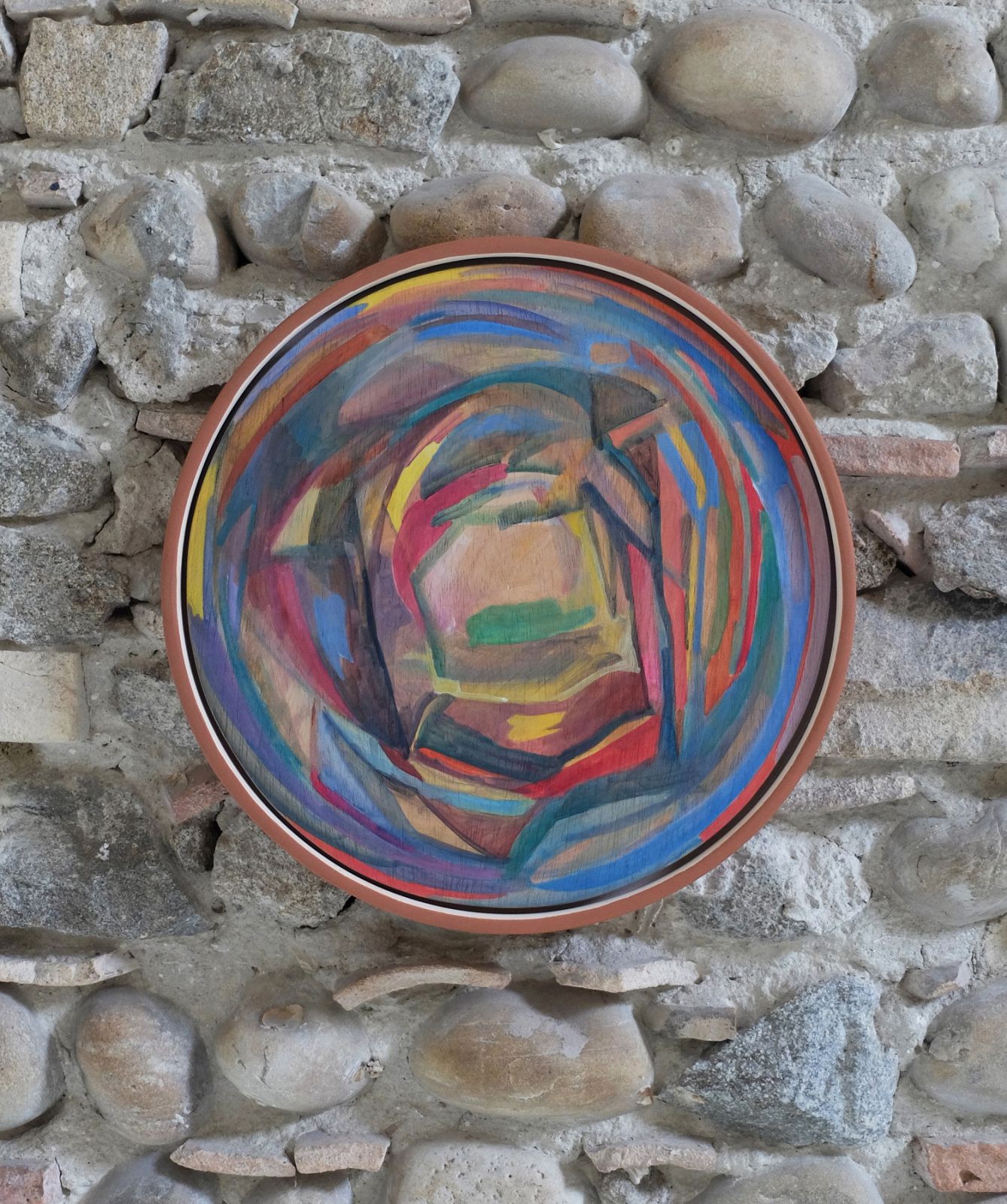 Acrylique sur bois et faïence engobée, diamètre 43 cm, épaisseur 4 cm