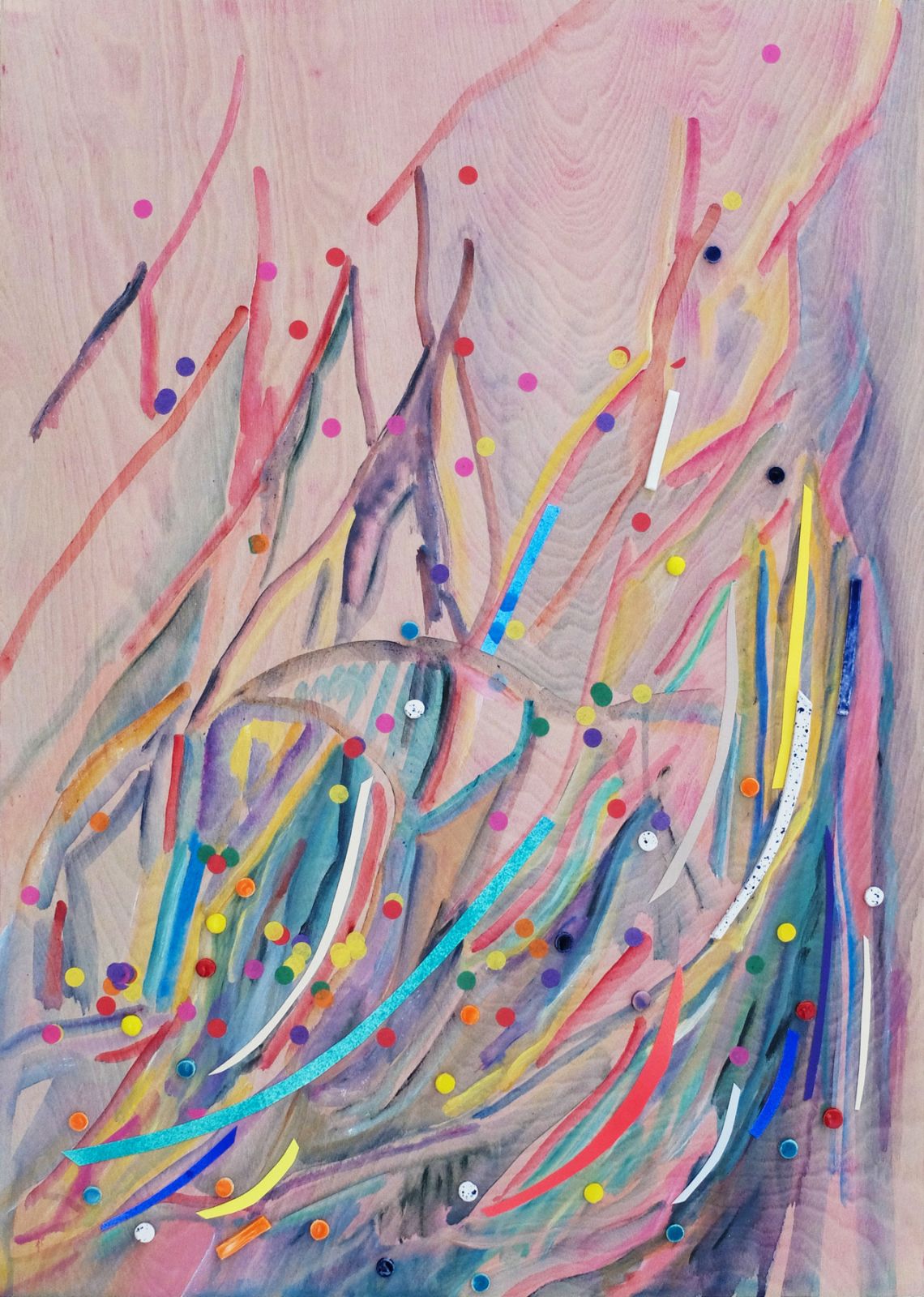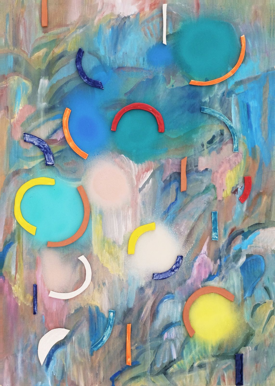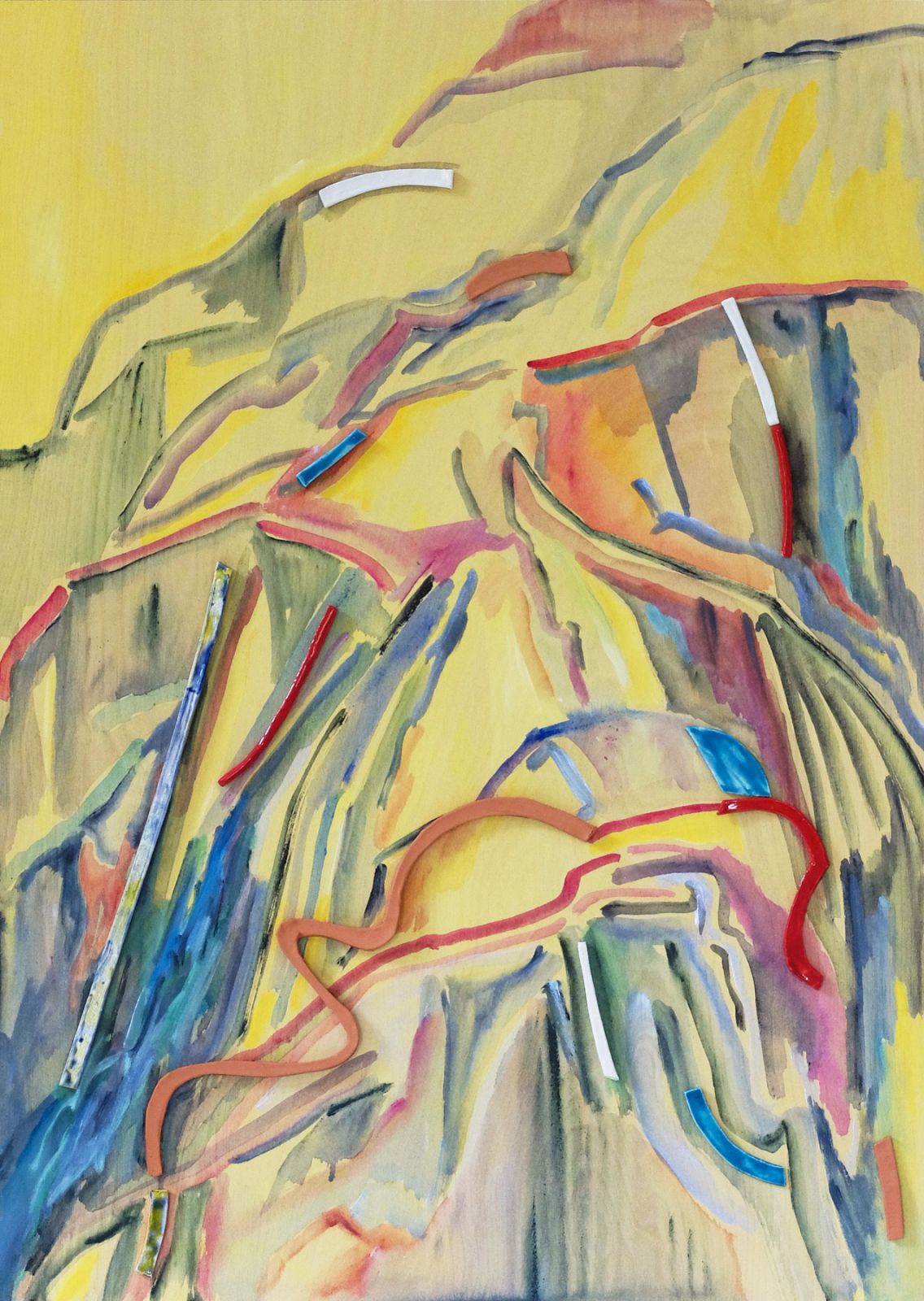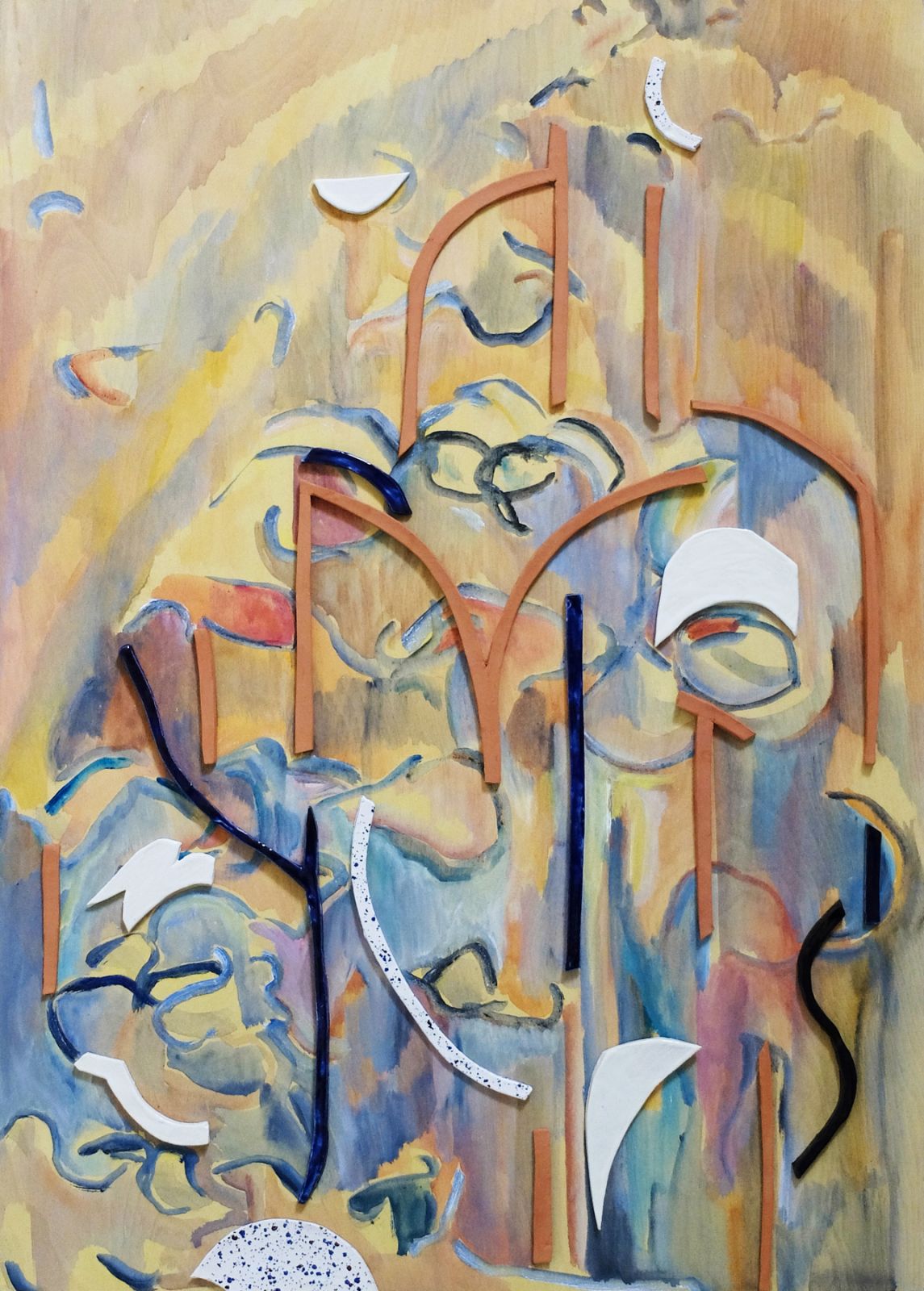 Acrylique, collages papier et faïence émaillée sur bois, 70 x 50 cm