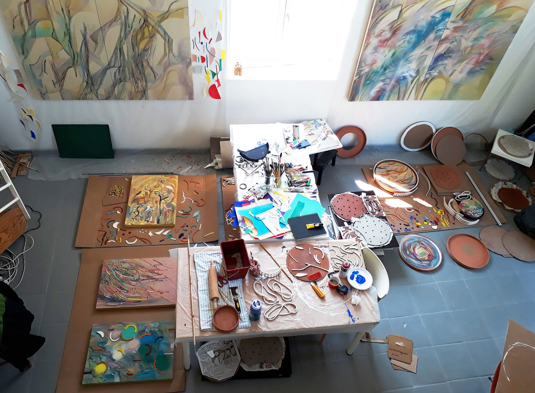 Il y a eu aussi la rencontre avec Jean-Jacques Dubernard, qui a ouvert à Lise Roussel les portes de la poterie des Chals, à Roussillon. Avec la terre, Lise a trouvé une nouvelle alliée à sa peinture, comme pour la renforcer, la soutenir, tel le roseau face au vent. Des formes circulaires en bois sont enchâssées dans un plateau en terre cuite, traité à l'engobe. Ces tondos, de l'italien rotondo (format rond connaissant son apogée durant la Renaissance), accueillent les motifs qui caractérisent la peinture de Lise Roussel : tracés libres ou géométriques, collages et pochoirs s'assemblent en de souples compositions gleiziennes, rappelant la fluidité de l'eau, la flexibilité des roseaux.