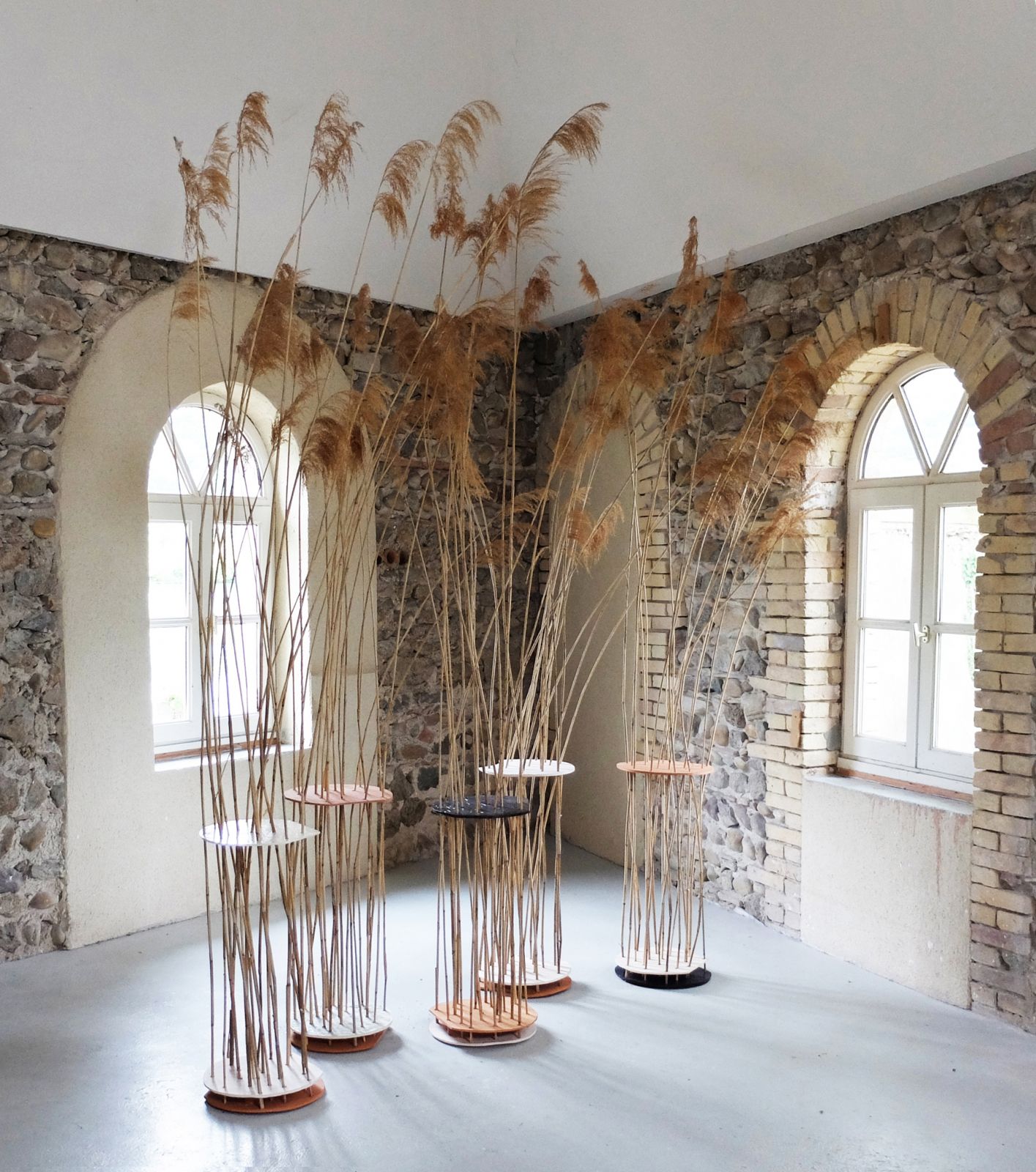 5 modules en terre cuite et faïence émaillée, roseaux, tiges métalliques et bois, dimensions variables