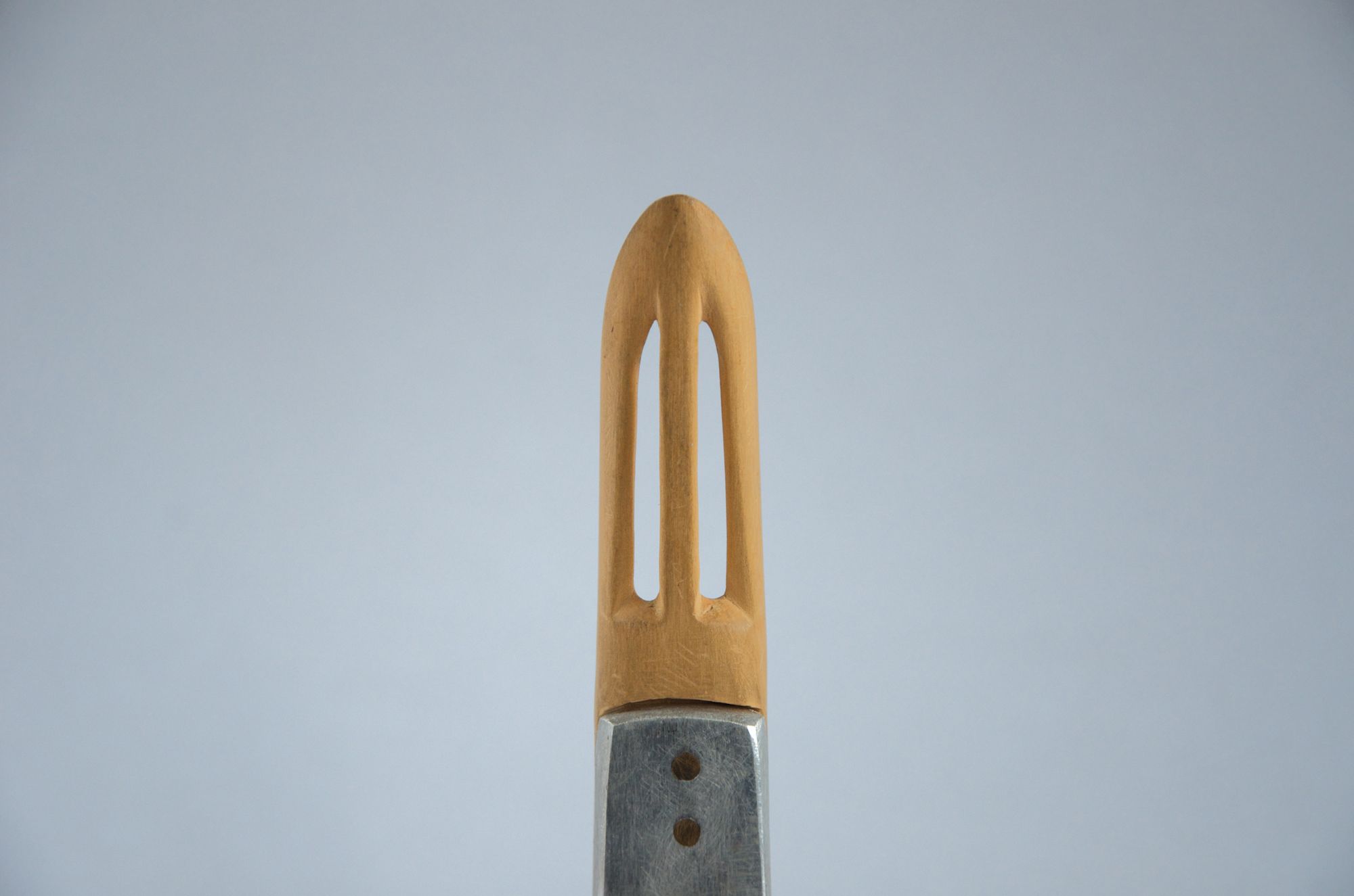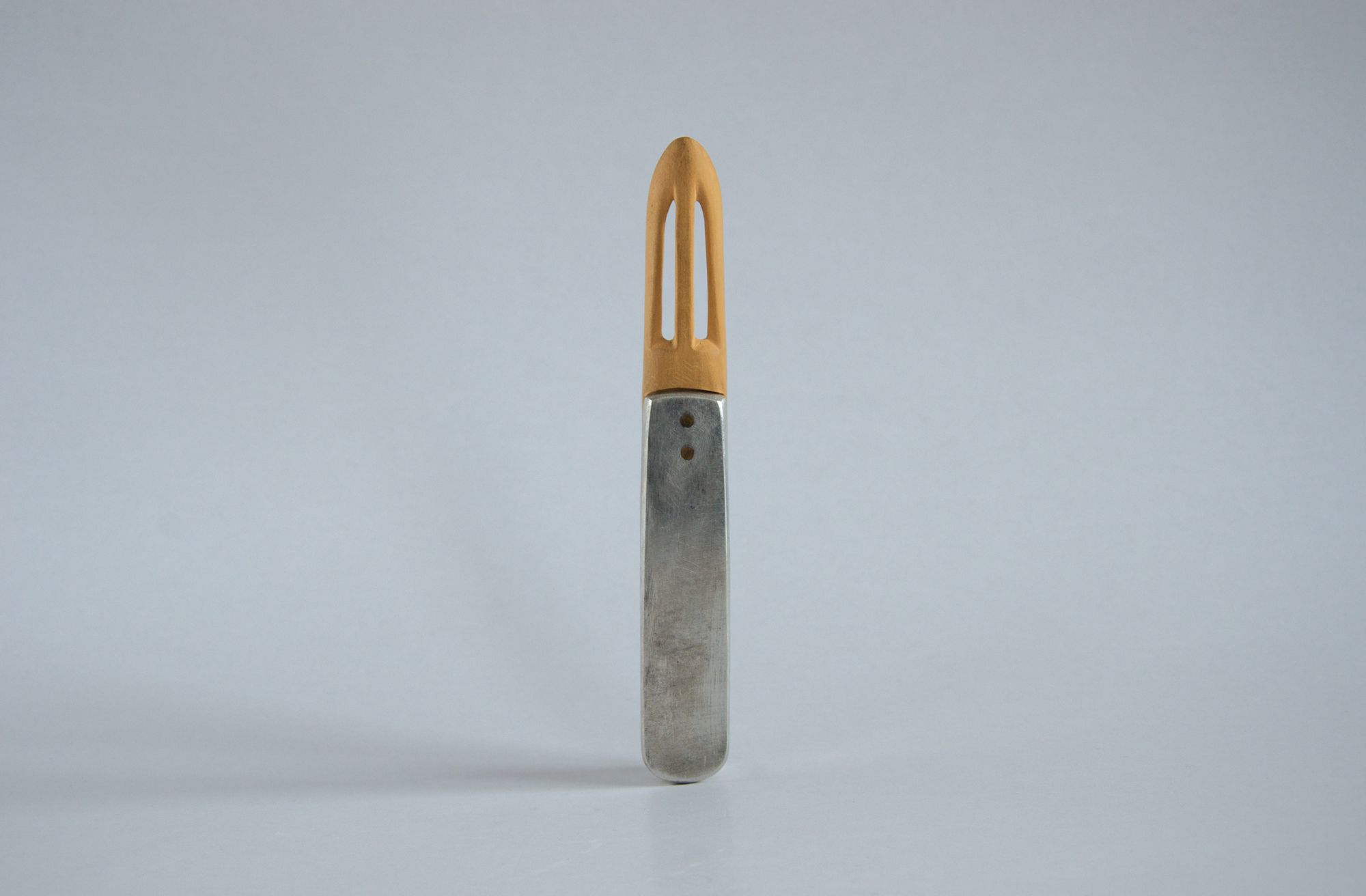 L'Économe, réalisé en 1998, fut ma toute première copie d'objet. Il s'agit d'un objet fabriqué à ma manière, imitant l'ustensile de cuisine bien connu. Jeu d'inversion des matériaux, jeu sur la ressemblance légèrement décalée avec l'objet copié, relation entre le titre et l'objet... c'est un objet "programmatique" comme on dit aujourd'hui.