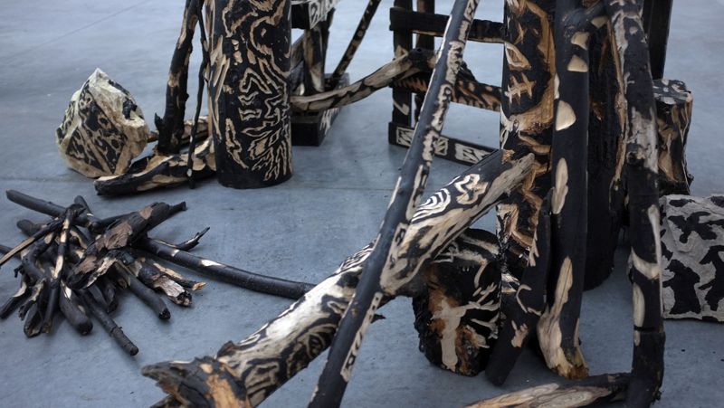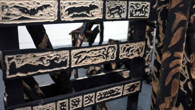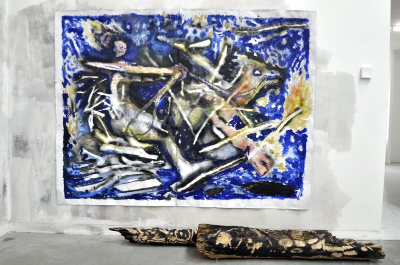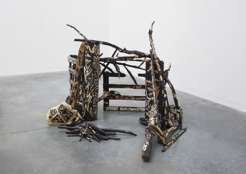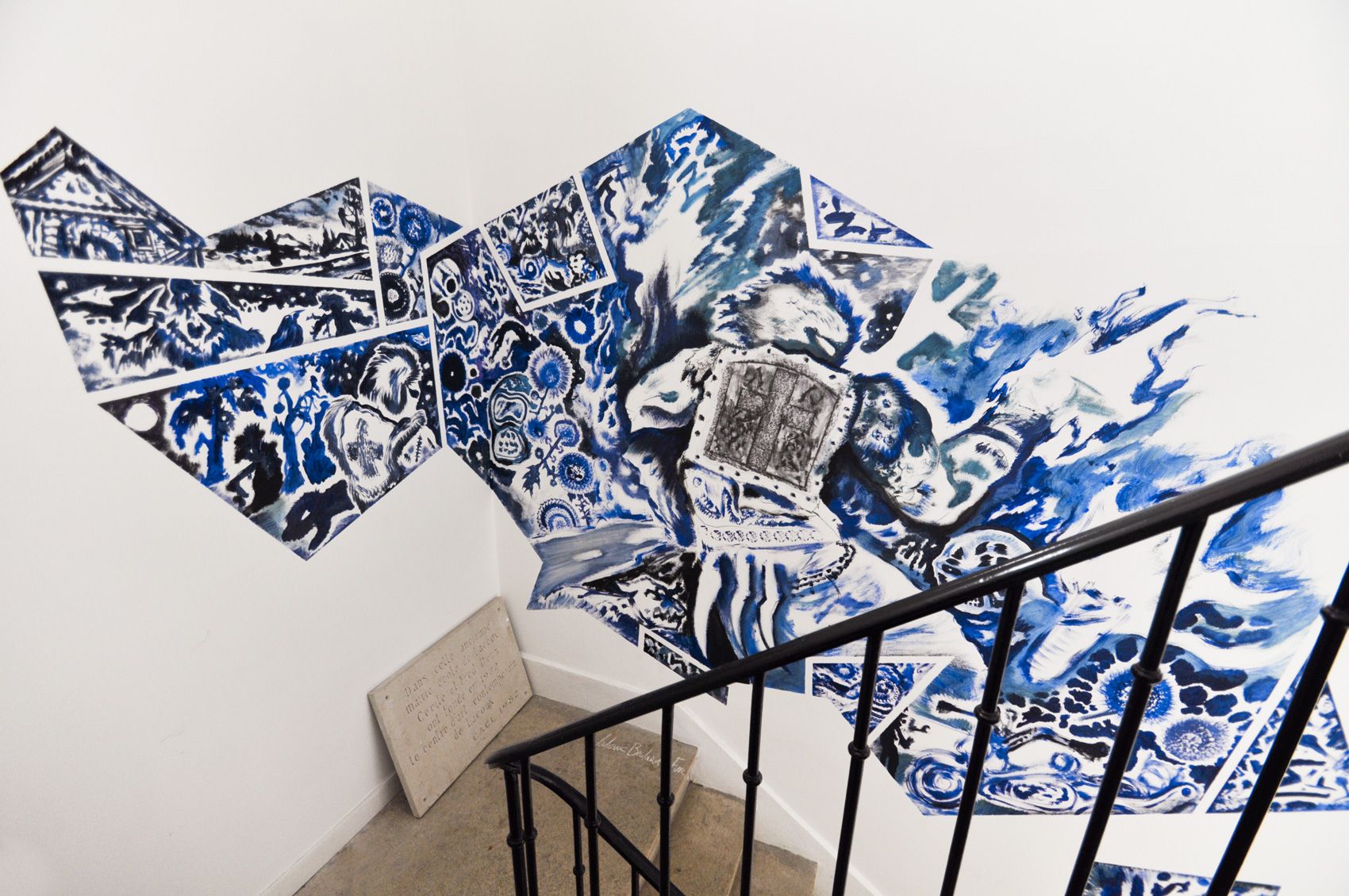 Installation de bois peint et gravé, peinture murale et technique mixte sur papier