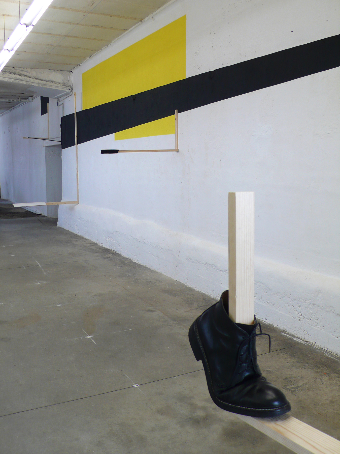 Projet in situ, peinture, bois, feuilles de papier, chaussure