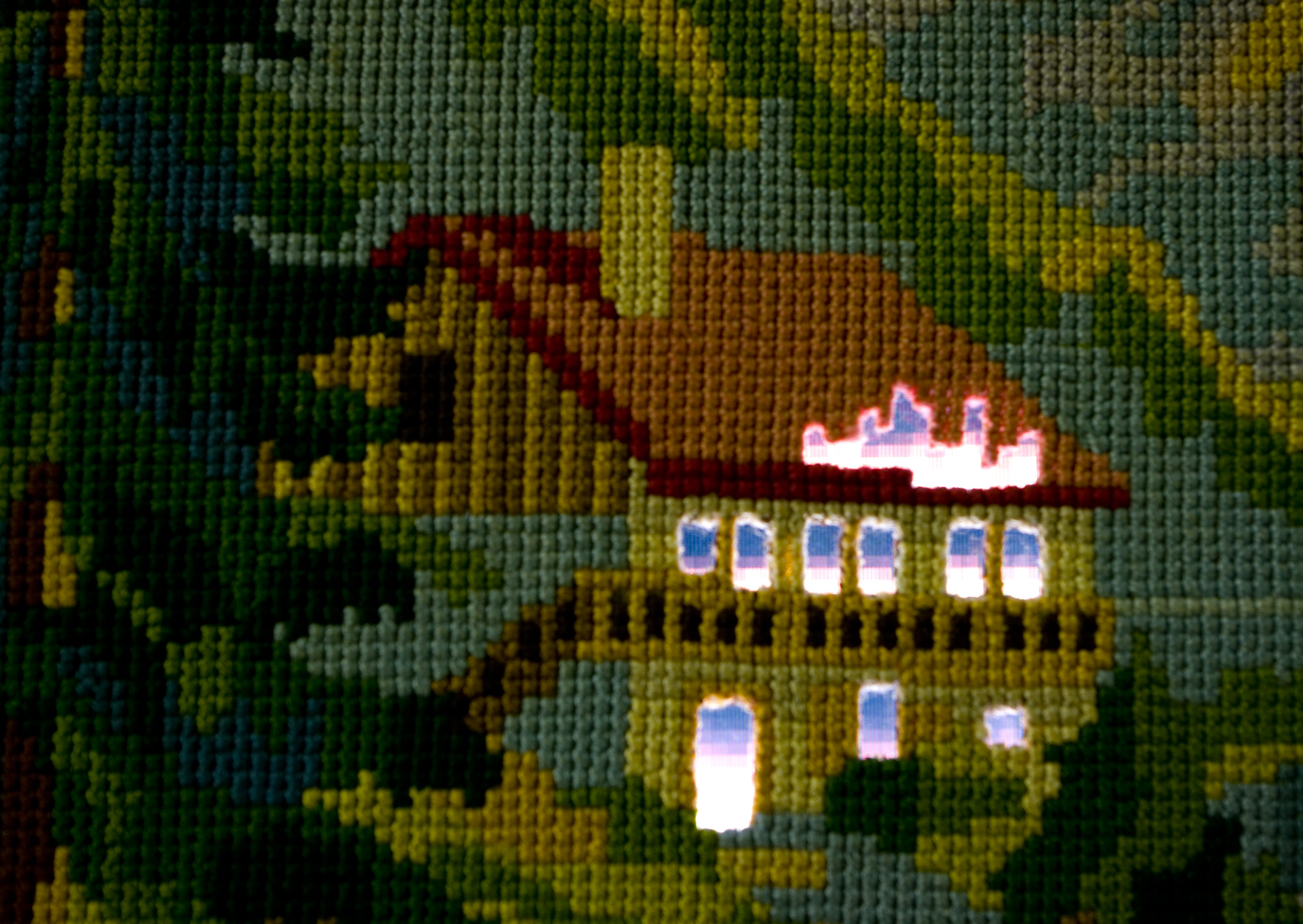 L'image diffusée qui s'intègre au motif du canevas est pixélisée à l'identique du point de croix de celui-ci.