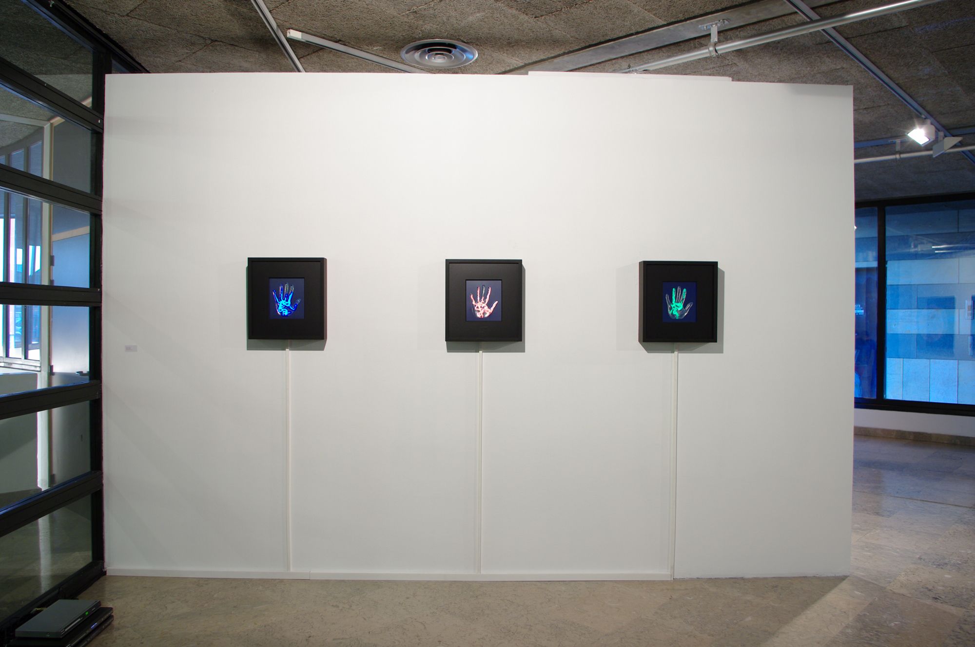 Vidéo diffusée sur un écran à travers une main moulée en résine transparente. La main est traversée de lignes de couleurs dont le mouvement est visiblement déformé par la matière de la résine.