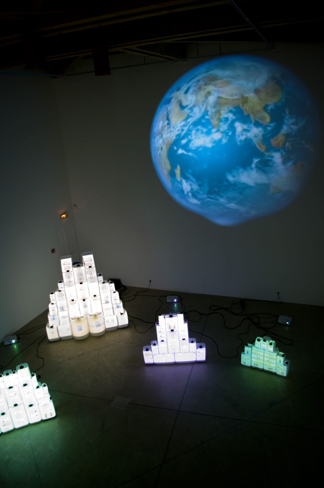 L'image projetée est celle de la planète Terre tournant sur elle-même. Celle-ci est animée d'enflures en surface de la croûte terrestre qui en déforment l'image parfaitement sphérique. Les images ayant servi à la réalisation de cette pièce sont extraites de photos d'un satellite météo. / + Lire Ce que la terre nous dit, Laetitia Sellam, 2007